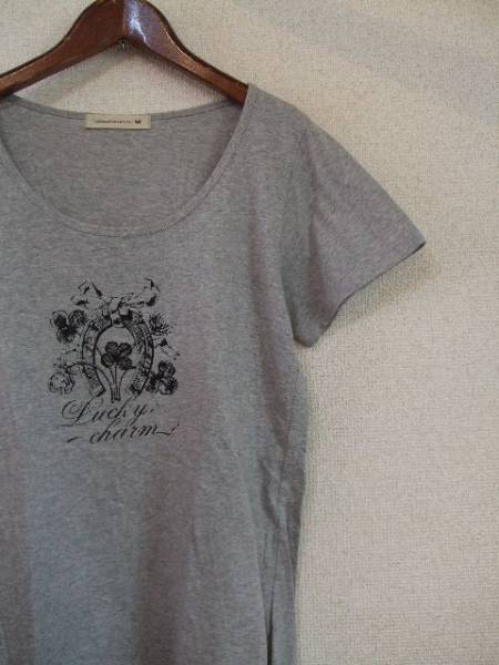 | 商品紹介 | クローバー等のプリントがかわいいTシャツタイプのチュニックです。 色はグレーにプリント部分は黒です。 ややAラインの形で、お尻が隠れる位の長さです。 《素材》 綿100% |