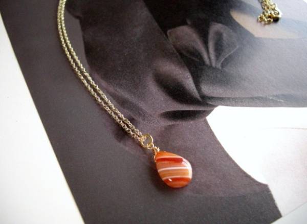 ずっとお気に入り・・シリーズです♪初夏のカーネリアン・・シックなカーネリアンのネックレスです♪ふんわりやさしい色合 いとストライプ模 様がキュートなカーネリアンが可憐な表情です♪18×13ミリ位のフラットドロップのカーネリ アンに華奢なチェーンを合わせました♪長さは75センチ+アジャスター10センチで最長85センチ位です♪お揃いのネックレスやブレスレットも出品しています♪シンプルで 飽きのこ ないいつまでも着けられるデザインを考えて作りました!ハンドメイドをご理解頂いてノークレーム、ノーリターンでお願いします