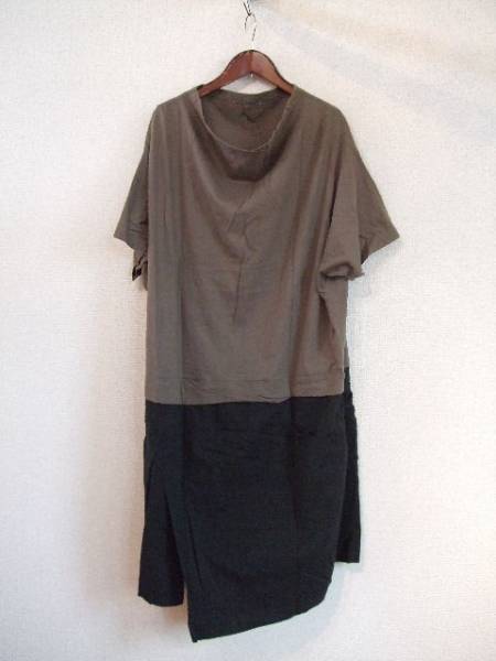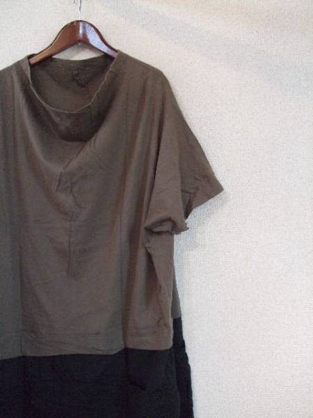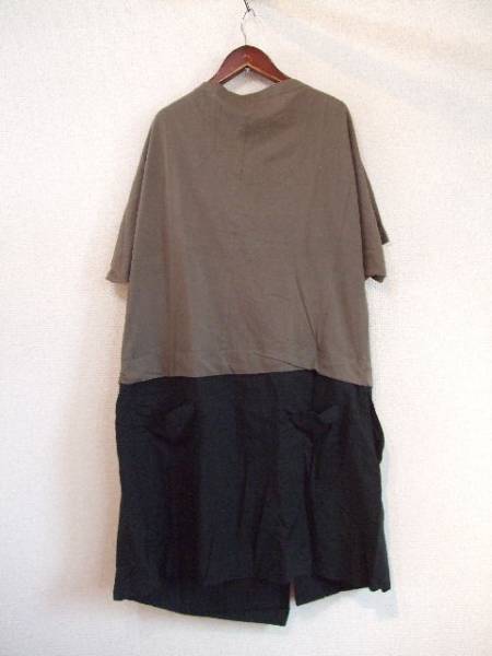 | 商品紹介 | カーキのカットソーと黒のブラウス素材を組み合わせたオシャレな ワンピースです。 襟はやや横に広がったハイネックです。 かなりゆったりしたデザインで、袖は5部くらいです。 右裾に長さの違うスリット(27cm位)が入っています。 《素材》 綿100% |