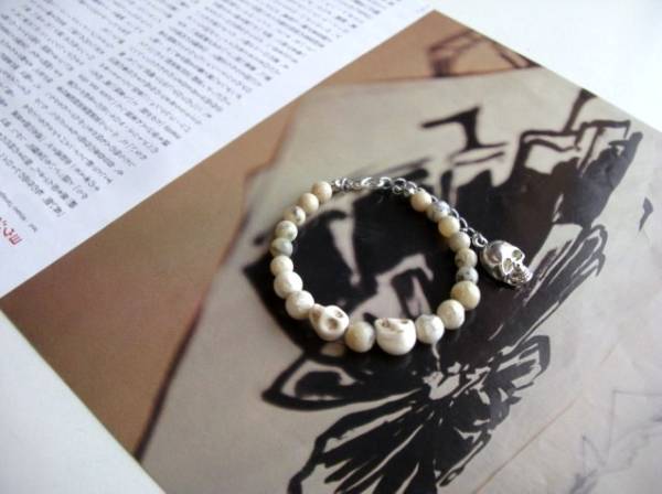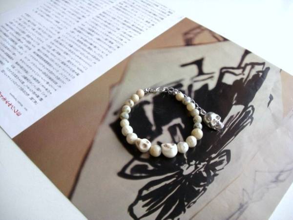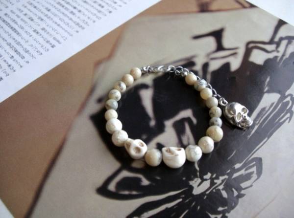 儚さを重ねて・・シリーズです♪シュールな髑髏さん・・ふんわりやさしいアフリカンオパールのブレスレットです♪6ミリ、8ミリの丸玉を紡ぎました。同じオフホワイトの髑髏のビーズを合わせてシュールな表情です♪長さは16センチ+アジャスター6センチで全長22センチ位です♪揃いのネックレスも出品しています♪♪シンプルで長く着けていただけるデザインを考えて作りました♪ハンドメイドをご理解頂いてノークレーム、ノーリターンでお願いします
