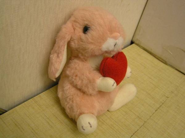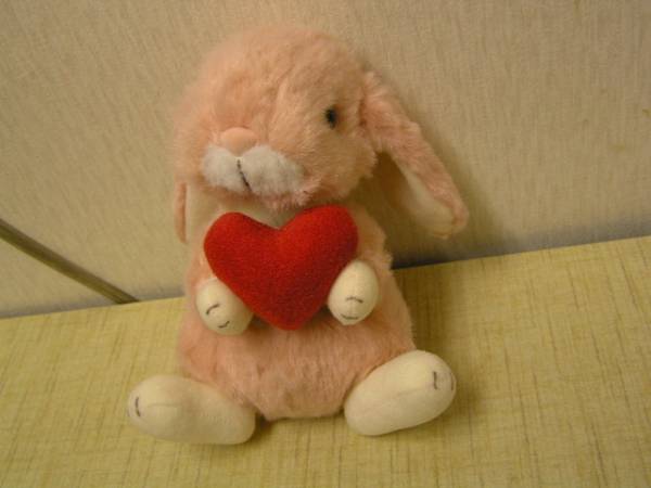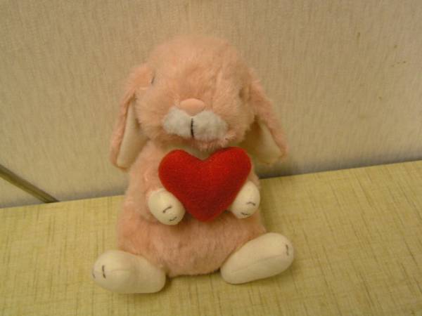 ふわふわでやわらかなウサギのぬいぐるみです。手にはハート持ってます。