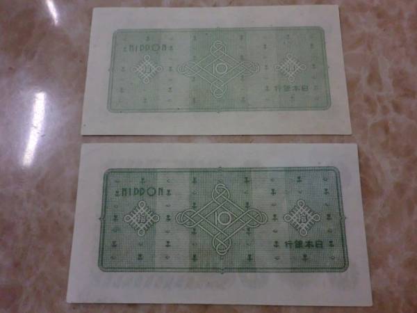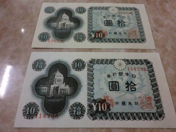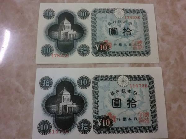 日本銀行券A号10円 議事堂10円の武生工場を2枚セットです。(評価 1枚 4500円有り)