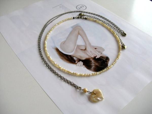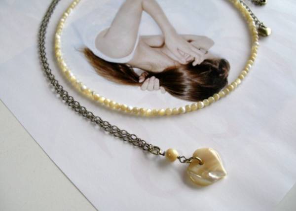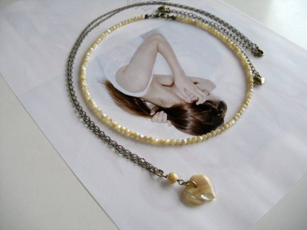 自由と遊びのパターン・・シリーズです♪ベージュ色の魔法・・シックなマザーオブパールのネックレスです♪♪ネックレスはデザイン違いの2点です♪小粒の丸玉やハートのマザーオブパールが可憐な表情です♪3ミリの丸玉のマザーオブパールのネックレスは40センチ+アジャスター12センチで最長52センチ位です♪20ミリ位のハートのマザーオブパールのネックレスは華奢なチェーンを合わせました♪長さは76センチ+アジャスター12センチで最長88センチ位です♪お揃いのブレスレットやピアスも出品しています♪シンプルで飽きのこないいつまでも着けられるデザインを考えて作りました♪ハンドメイドをご理解頂いてノークレーム、ノーリターンでお願いします