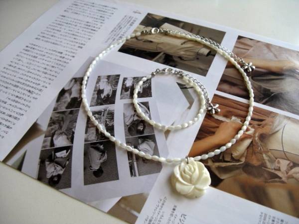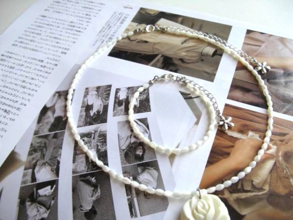 アンティーク仕様・・シリーズです♪高貴な白・・オフ・ホワイトのマザーオブパールとボーンの薔薇のネックレスとブレスレット2点セットです♪重ねても単品でも楽しんでいただけます♪ライス型のマザーオブパールにボーンの薔薇を合わせてクラシカルな表情です♪ネックレスは5×3ミリ位のライス型のマザーオブパールに25ミリ位のボーンの薔薇を合わせました♪長さは42センチ+アジャスター10センチで最長52センチ位です♪ブレスレットは16センチ+アジャスター6センチで最長22センチ位です♪それぞれ単品やお揃いのネックレスも出品しています♪シンプルで長く着けていただけるデザインを考えて作りました!ハンドメイドをご理解頂いてノークレーム、ノーリターンでお願いします