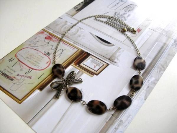 ニューヨーク・テイスト・・シリーズです♪パンク少女・・シックな豹柄のネックレスです♪レース模様のリボンチャームを合わせてパンクっぽい表情です♪18×24ミリ位のフラットオーバルのシェルに40×26ミリ位のリボンチャームを合わせました♪長さは全長77センチ位で調節自由です♪チョーカー風に着けられても素敵です♪お揃いのブレスレットも出品しています♪シンプルで飽きのこないいつまでも着けられるデザインを考えて作りました♪ハンドメイドをご理解頂いてノークレーム、ノーリターンでお願いします