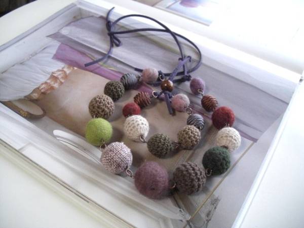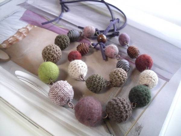 色で遊んで・・シリーズです♪春色セレクト・・ふんわりやさしい春色の異素材のネックレスとブレスレットの2点セットです♪10ミリから22ミリ位までのベージュやモーヴピンク、ボルドーやモスグリーン、ダークグリーンやブラウン、グレーやダークレッドの編みボールやサテンボールやフェルト玉を集めました♪ダークパープルのスェード紐を合わせて甘すぎない大人のロマンチックしています♪ネックレスの長さは全長90センチ位です♪短く結んでチョーカー風にされても素敵です♪ブレスレットの長さは全長28センチ位で調節自由です♪ハンドメイドをご理解いただいてノークレーム・ノーリターンでお願いします♪