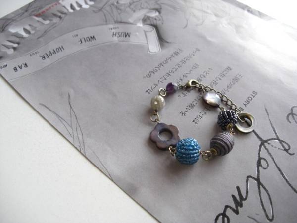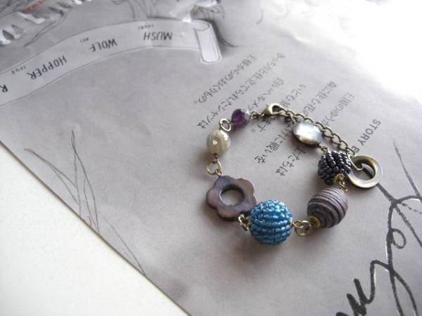創作ノート・・シリーズです♪ブルーグレーの章・・神秘的なブルーグレー系の異素材を集めたブレスレットです♪8ミリから18ミリ位までのシェルのオーバルやフラワーリング、ラブラドライトのオーバルカット、麻ビーズやビーズ玉など個性的な素材を集めてアンテークな表情です♪長さは全長23センチ位で調節自由です♪お揃いのネックレスも出品しています♪♪お揃いのシリーズも出品しています♪シンプルで長く着けていただけるデザインを考えて作りました♪ハンドメイドをご理解頂いてノークレーム、ノーリターンでお願いします