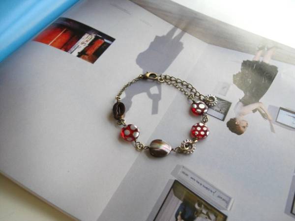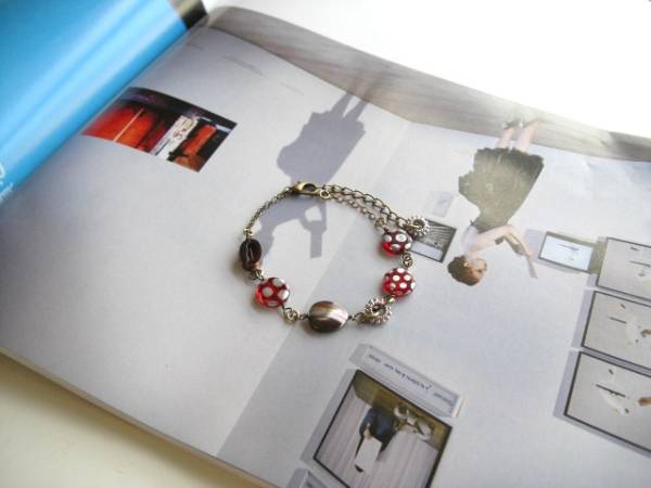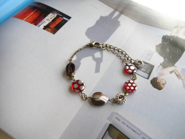 モダン・ガール・・シリーズです♪水玉マニア・・シックな水玉とシェルのブレスレットです♪ダークレッドの水玉とブラウングレーのシェルがロマンチックな表情です♪10ミリのディスクのチェコビーズはダークレッドにシルバーグレーの水玉です♪大きさ違いの水玉を合わせました♪ブラウングレーのシェルは10×14ミリ位のオーバルとリングです♪デザインチャームを合わせてキュートにロマンチックしています♪長さは17センチ+アジャスター5センチで最長22センチ位です♪お揃いのネックレスやピアスも出品しています♪♪シンプルで長く着けていただけるデザインを考えて作りました♪♪ハンドメイドをご理解頂いてノークレーム、ノーリターンでお願いします。