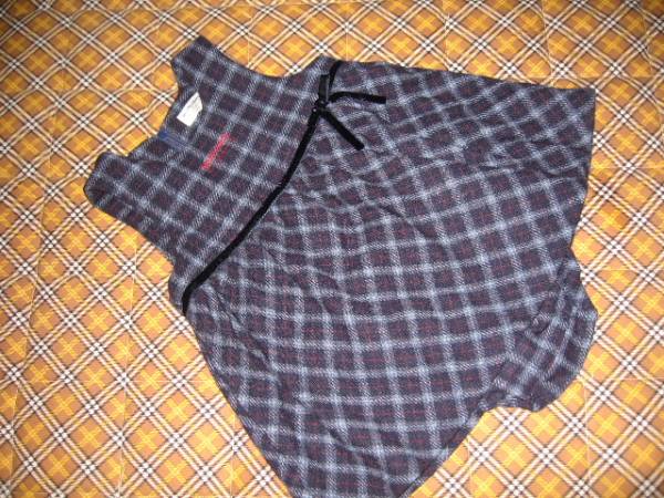 秋冬用。ふんわりした緩めの紺チェック地。丈45cm。毛70、ポリ15、アクリル10、ナイロン5%。使用品ですがほとんど(全く)使用感のないきれいなものです。