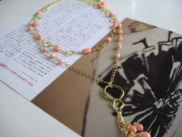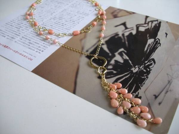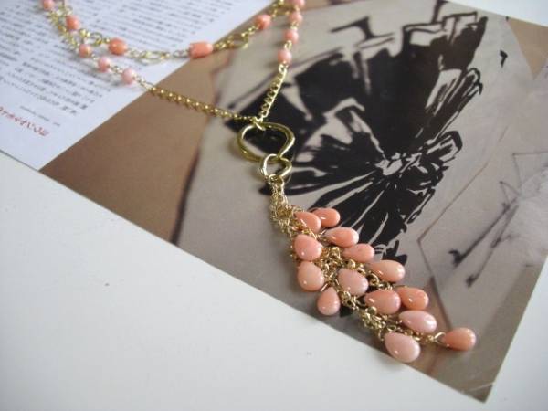 創作ノート・・シリーズです♪春色ピンクの章・・ナチュラルなサーモンピンクの珊瑚のネックレス2点セットです♪丸玉やドロップやお花の珊瑚を集めてやさしい表情です♪ラリエット風のデザインは6ミリの丸玉、8ミリから11ミリ位のフラットドロップです♪トップにデザインリングを合わせました♪長さは全長77センチ位で調節自由です♪トップは12センチ位です♪お花の珊瑚は6から8ミリ位です♪デザインリングを合わせて可憐な表情です♪長さは全長57センチ位で調節自由です♪チョーカー風にされてもブレスにされても素敵です♪それぞれ単品やお揃いのブレスレットやイヤリングも出品しています♪シンプルで飽きのこないいつまでも着けられるデザインを考えて作りました!ハンドメイドをご理解頂いてノークレーム、ノーリターンでお願いします