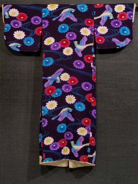 【アンティーク】流水に鳥と菊文 縮緬 一つ身 丈97 TACI01030風楽 |