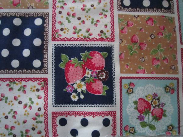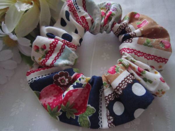 ★シュシュ★ ●イチゴと水玉のスクエアパッチ柄●紺系●