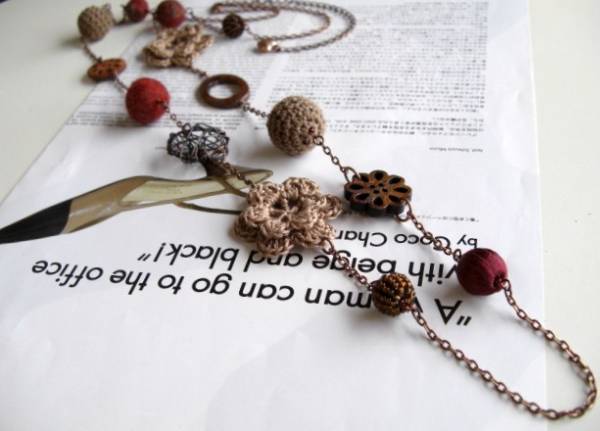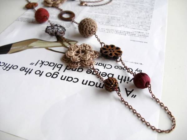 女の子らしさを+して・・シリーズです♪秋色の異素材・・シックな秋色のボルドーや煉瓦色やブラウンのフェルト玉やビーズボール、シェルリングや編みボールやウッドのお花、編みフラワーを集めてロマンチックなネックレスです♪10ミリから37ミリ位までの大きさ違い、デザイン違いの異素材がアンティークな表情です♪長さは100センチ+アジャスター15センチで最長115センチ位です♪お揃いのブレスレットも出品しています♪ハンドメイドをご理解頂いてノークレーム、ノーリターンでお願いします