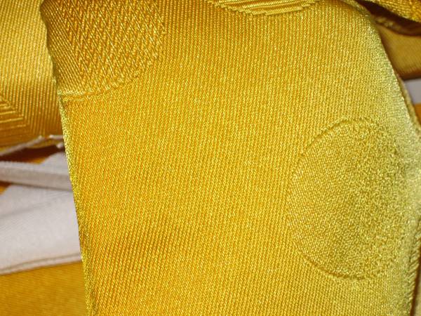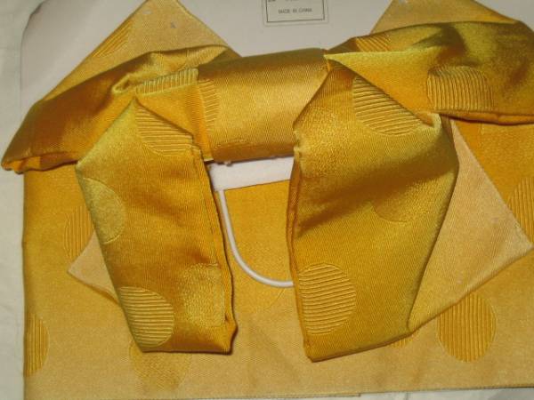 女性yukata用、地紋柄結び帯  黄ぼかし ポリエステル  新品(織り地紋柄ありです。波状の写りはレンズの光学的ないたずらで現品にはありません、また薄く濃く写っている場合もあります)、胴部--帯巾約16,5cmx長さ約130cm、リボン部は横に約30cm。見た範囲で汚れないと思いますが、着用に差し支えない薄汚れ(多分ない?)はあってものお値段で出品です。