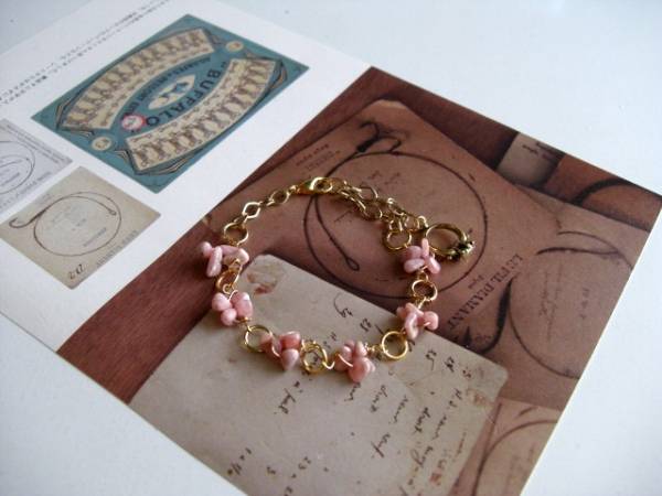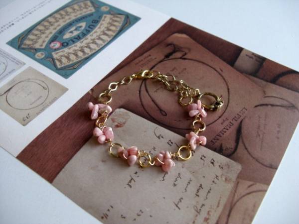 切ない恋・・シリーズです♪アンティークピンクを集めて・・可憐なインカローズのブレスレットです♪甘さを抑えたアンティークピンクのインカローズは小さなさざれです♪デザインチェーンを合わせてロマンチックしています♪インカローズのチップは小さな花束のように集めてデザインチェーンを合わせました♪長さは全長23センチ位で調節自由です♪お揃いのネックレスも出品しています♪シンプルで飽きのこないいつまでも着けられるデザインを考えて作りました♪ハンドメイドをご理解頂いてノークレーム、ノーリターンでお願いします