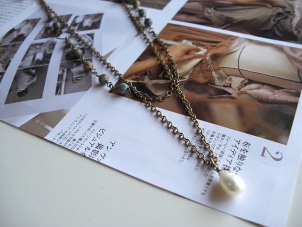 初夏のクローゼット・・シリーズです♪ターコイズの定番・・シックなターコイズの2連のネックレスです♪大きさ違いの丸玉のターコイズに淡水パールのドロップをアクセントにして大人っぽい表情です♪ターコイズは6ミリ、8ミリ、10ミリ、12ミリの丸玉です♪淡水パールのドロップは13×9ミリ位です♪長さは92センチ+アジャスター13センチで最長105センチ位です♪お揃いのブレスレットも出品しています♪シンプルで飽きのこないいつまでも着けられるデザインを考えて作りました!ハンドメイドをご理解頂いてノークレーム、ノーリターンでお願いします