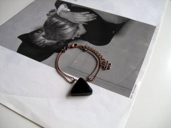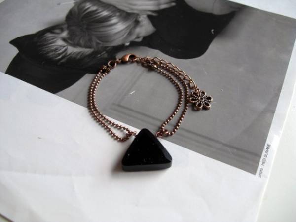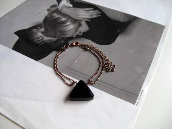恋する人・・シリーズです♪オニキス&ダルメシアン・・シックなモノトーンとまとめたブレスレットです♪漆黒のオニキスがキュートな表情です♪存在感のあるオニキスは20ミリ位のトライアングルカットです♪華奢な2連のボールチェーンを合わせました♪長さは16センチ+アジャスター6センチで最長22センチ位です♪お揃いのブレスレットやネックレスも出品しています。ハンドメイドをご理解頂いてノークレーム、ノーリターンでお願いします