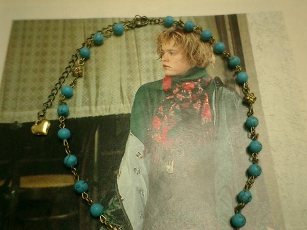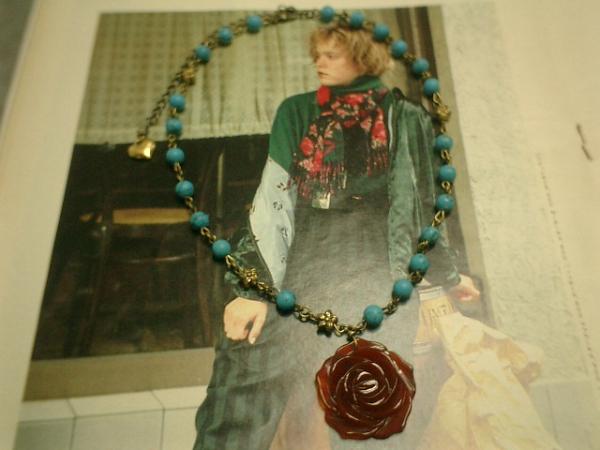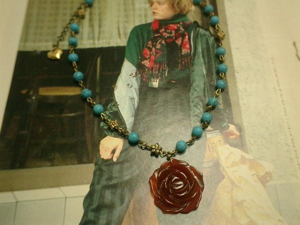 シックなターコイズと薔薇のネックレスを作りました♪シックなお色のターコイズがこれからの季節にぴったりです。6ミリのターコイズの丸玉とお花のメタルビーズをつないでいます。トップは深い落ち着いたお色のレッドアゲートです。ロンドンっぽい雰囲気なのでパンクのお好きな方にも♪シンプルで飽きのこないいつまでも着けられるデザインを考えて作りました!ネックレスの長さは38センチ+アジャスター10センチで最長48センチ位です。間に丸カンを使っているのでチョーカー風にも着けて頂けます。トップの薔薇は3センチ位です。ハンドメイドをご理解頂いてノークレーム、ノーリターンでお願いします