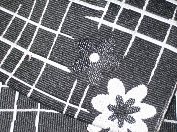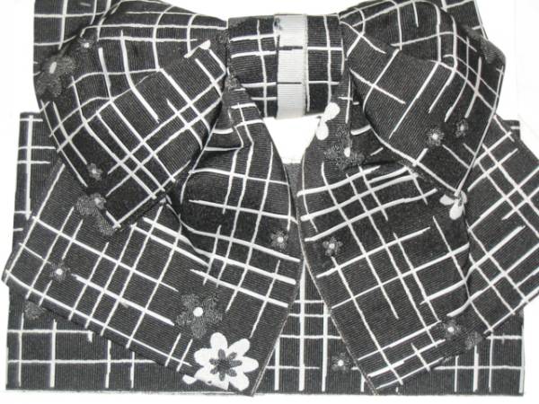 女性yukata用、地紋柄結び帯  くろ ポリエステル  新品(織り地紋柄ありです。波状の写りはレンズの光学的ないたずらで現品にはありません、また薄く濃く写っている場合もあります)、胴部--帯巾約17,0cmx長さ約130cm、リボン部は横に約30cm。見た範囲で汚れないと思いますが、着用に差し支えない薄汚れ(多分ない?)はあってものお値段で出品です。