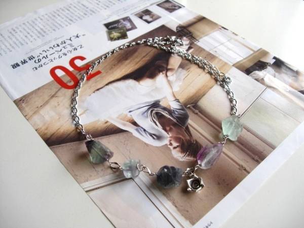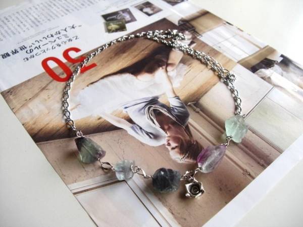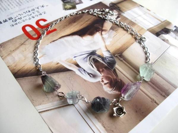 6月の花嫁・・シリーズです♪パステル色の雨・・儚げなフローライトのネックレスです♪ラフロックのフローライトは淡いブルーやグリーンやピンクやパープルのやさしい色がロマンチックな表情です♪13ミリから16ミリのフローライトはカレンシルバーの薔薇やデザインチェーンを合わせました♪長さは全長60センチ位で調節自由です♪チョーカー風にされても素敵です♪お揃いのネックレスやブレスレットも出品しています♪シンプルで飽きのこないいつまでも着けられるデザインを考えて作りました!ハンドメイドをご理解頂いてノークレーム、ノーリターンでお願いします