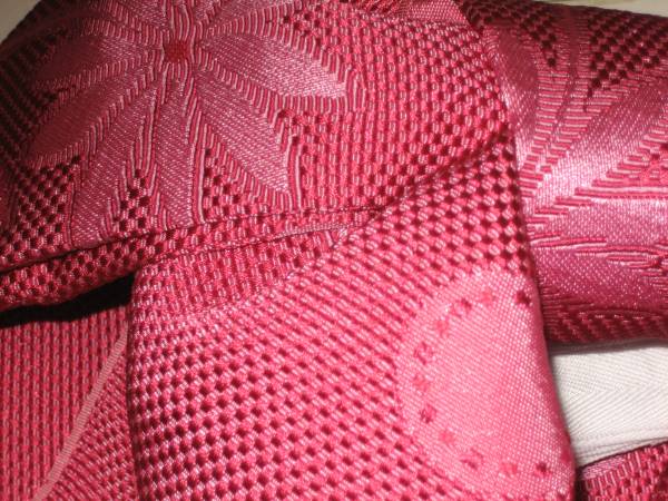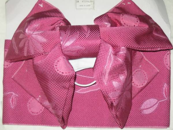 女性yukata用、地紋柄結び帯 くすみこいめピンク ポリエステル  新品(織り地紋柄ありです。波状の写りはレンズの光学的ないたずらで現品にはありません、また薄く濃く写っている場合もあります)、胴部--帯巾約16,5cmx長さ約130cm、リボン部は横に約30cm。見た範囲で汚れないと思いますが、着用に差し支えない薄汚れ(多分ない?)はあってものお値段で出品です。