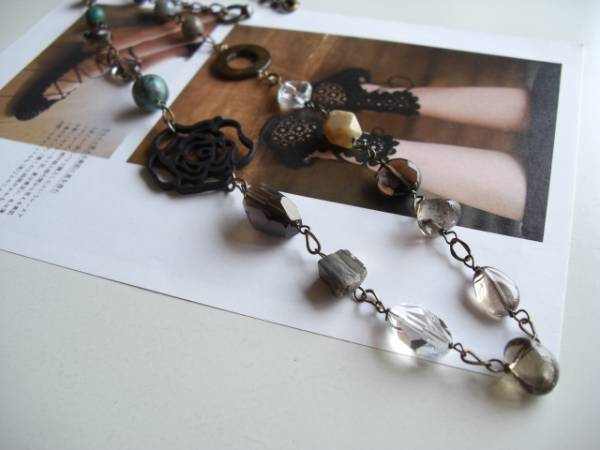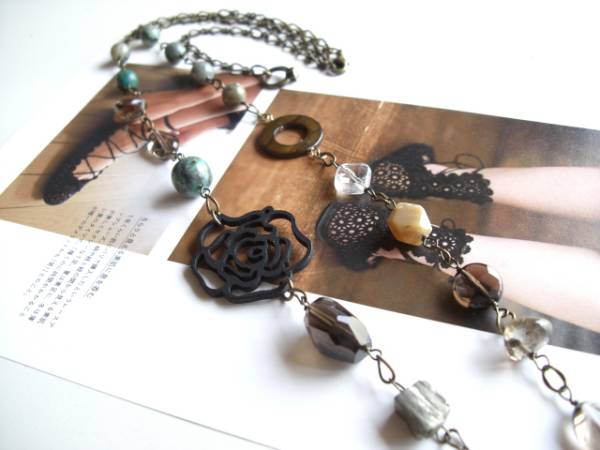 初夏のクローゼット・・シリーズです♪ターコイズと薔薇と・・シックなターコイズとウッドの薔薇のネックレスです♪モスグリーンのターコイズに水晶やスモーキークォーツ、パイライトやルチルクォーツ、シェルリングを合わせてロマンチックな表情です♪ターコイズは8ミリ、12ミリの丸玉、ウッドの薔薇は32ミリ、水晶やスモーキークォーツ、ルチルクォーツやパーライトはラフカットやコインカット、オーバルツイストなどのデザイン違いです♪長さは全長90センチ位で調節自由です♪お揃いのブレスレットも出品しています。ハンドメイドをご理解頂いてノークレーム、ノーリターンでお願いします |