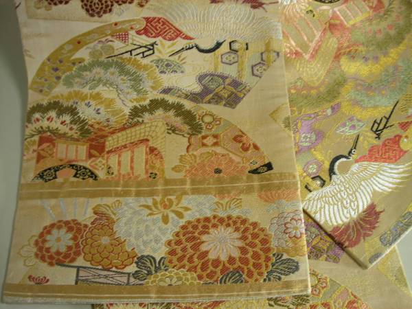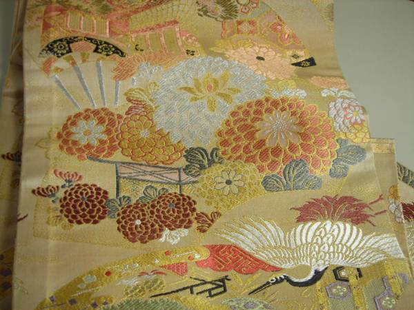アンティーク 丸帯 ★USED。「御所車 菊 松 七宝 鶴 古典模様でうめつくされた華やいだ丸帯です。金糸 銀糸が織り込んであるアンティークな丸帯 地色にとけこんだ タペストリーにしても落ち付きのある古き良き時代の丸帯」  サイズ長さ約396センチ、巾約31センチ 1470g  USEDをご理解の上宜しくお願いいたします。