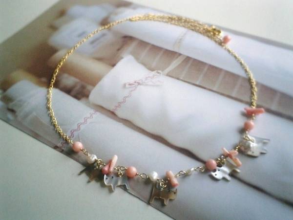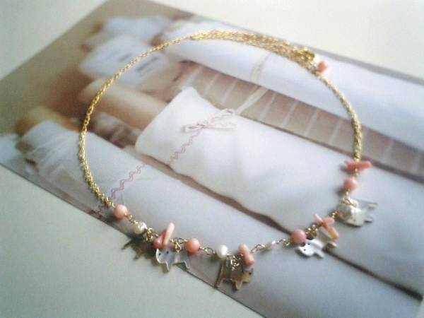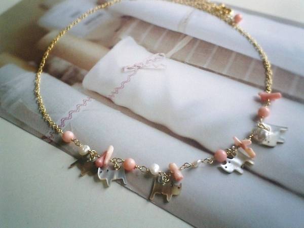 物語をアートして・・シリーズです♪猫とお散歩・・キュートな猫さんのネックレスです♪春色の珊瑚や淡水パールにシェルの猫さんを合わせてロマンチックな表情です♪ピンク珊瑚の丸玉やさざれにバロックの淡水パールや14×12ミリ位のホワイトシェルの猫さんを合わせました♪長さは全長80センチ位で調節自由です♪チョーカー風にされても素敵です♪お揃いのブレスレットも出品しています♪シンプルで合わせやすいデザインです♪♪ハンドメイドをご理解頂いてノークレーム、ノーリターンでお願いします