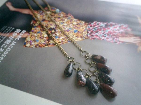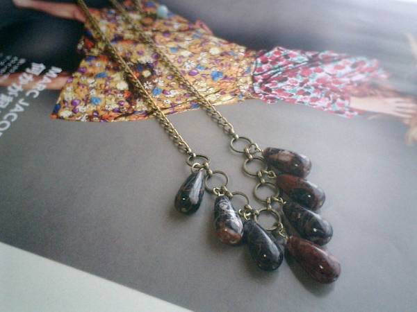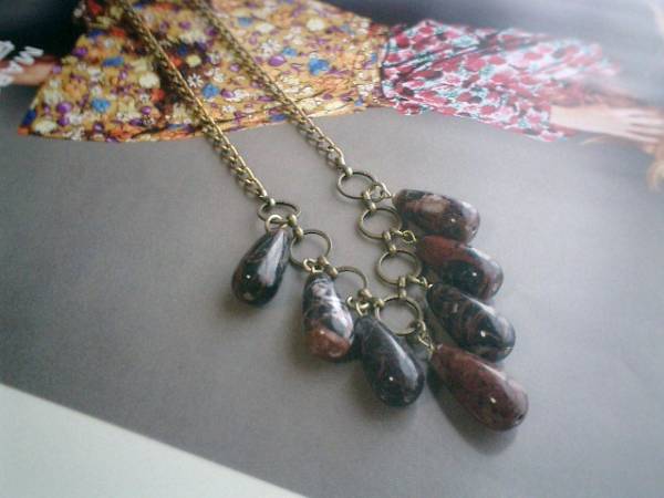 イーニド・ファッション・・シリーズです♪アート革命・・シックなピクチャージャスパーのネックレスです♪シックなブラウンやベージュの色合いが個性的なジャスパーがアート・モダンな表情です♪ジャスパーは20×10ミリ位のフラットドロップです♪デザインチェーンに合わせました♪長さは全長70センチ位で調節自由です♪チョーカー風にされても素敵です♪お揃いのネックレスやブレスレットやイヤリングも出品しています♪シンプルで飽きのこないいつまでも着けられるデザインを考えて作りました!ハンドメイドをご理解頂いてノークレーム、ノーリターンでお願いします