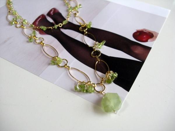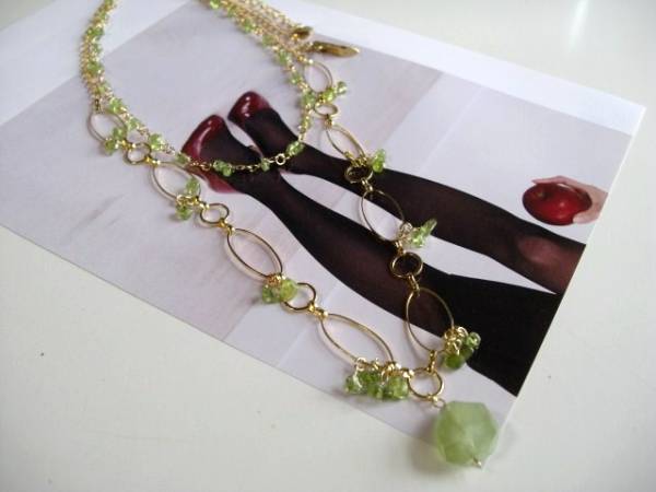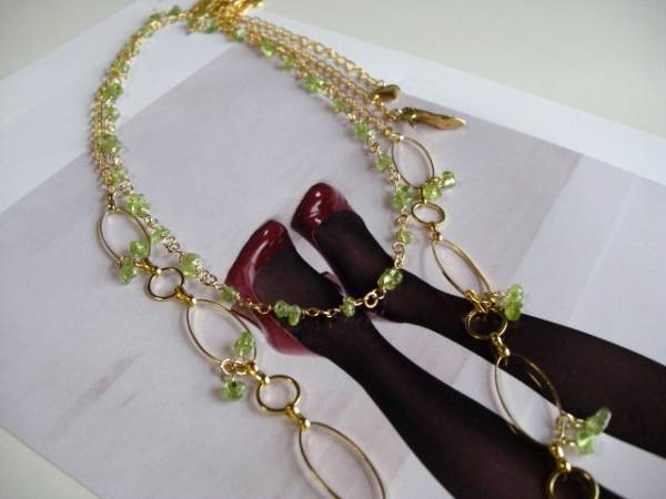 パリの衣裳部屋・・シリーズです♪夜会服の宝石・・繊細なエメラルドグリーンのペリドットのネックレス2点セットです♪暗緑色のペリドットが可憐な表情です♪長い方のネックレスはデザインチェーンに5ミリ位のさざれのペリドットと18×16ミリ位のラフカットのペリドットを合わせました♪長さは80センチ位で調節自由です♪短い方のネックレスは5ミリ位のさざれのペリドットを華奢なチェーンに繋いで合わせやすいデザインです♪長さは全長62センチ位で調節自由です♪それぞれ単品やブレスレットやピアスも出品しています♪シンプルで飽きのこないいつまでも着けられるデザインを考えて作りました!ハンドメイドをご理解頂いてノークレーム、ノーリターンでお願いします
