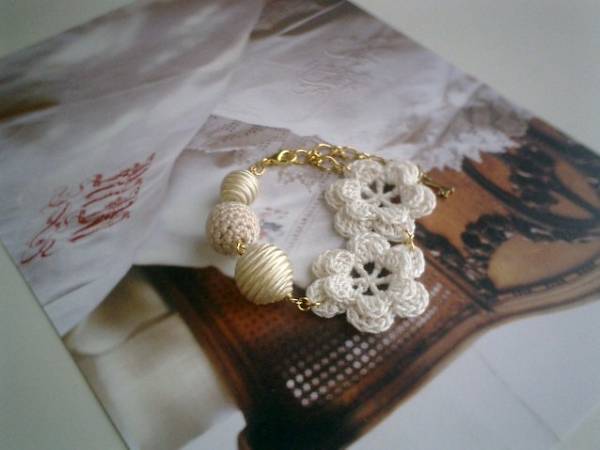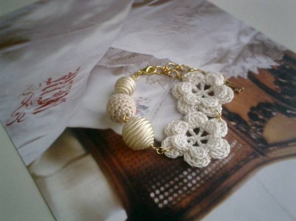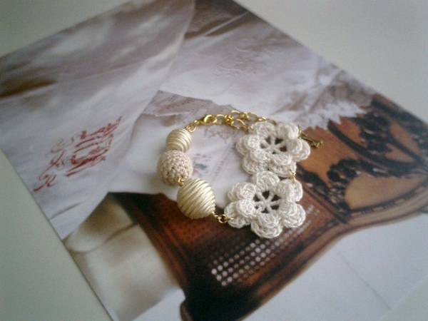 コゼットの裁縫箱・・シリーズです♪やさしい夢を見て・・ふんわりやさしいオフ・ホワイトのブレスレットです♪編みフラワー、編みボールやサテンボールなどを集めてロマンチックな表情です♪12ミリから35ミリ位までのサテンボールや編みボール、編みフラワーを合わせました♪長さは全長23センチ位で調節自由です♪ホワイト・ベージュ色でまとめてふんわりやさしい表情です♪お揃いのブレスレットやネックレスも出品しています♪シンプルで飽きのこないいつまでも着けられるデザインを考えて作りました!ハンドメイドをご理解頂いてノークレーム、ノーリターンでお願いします