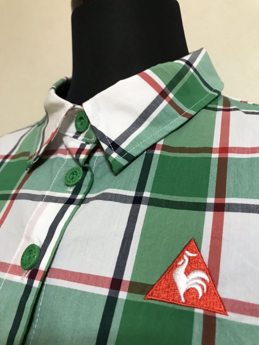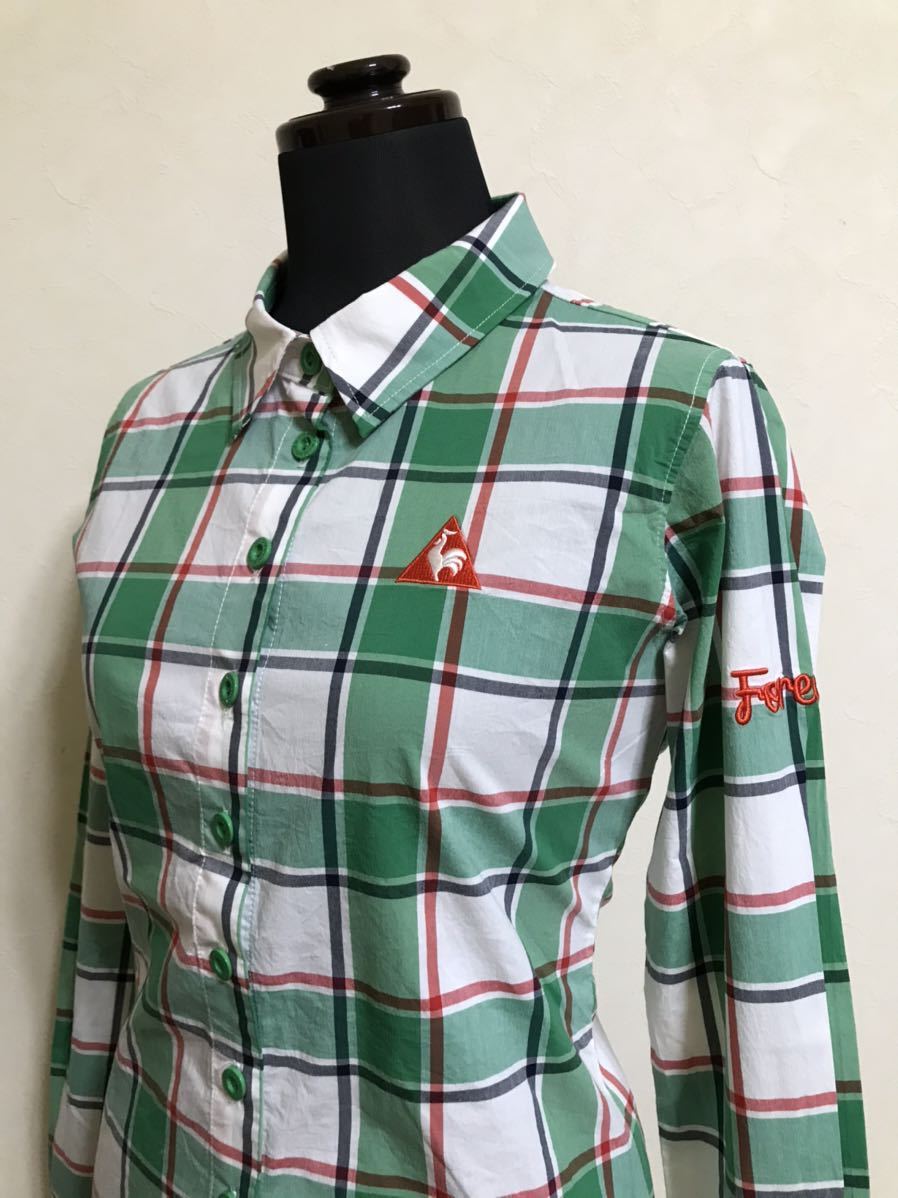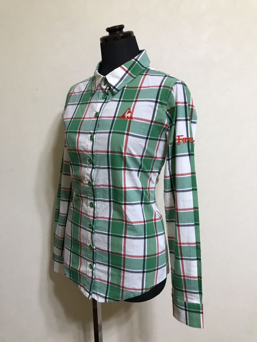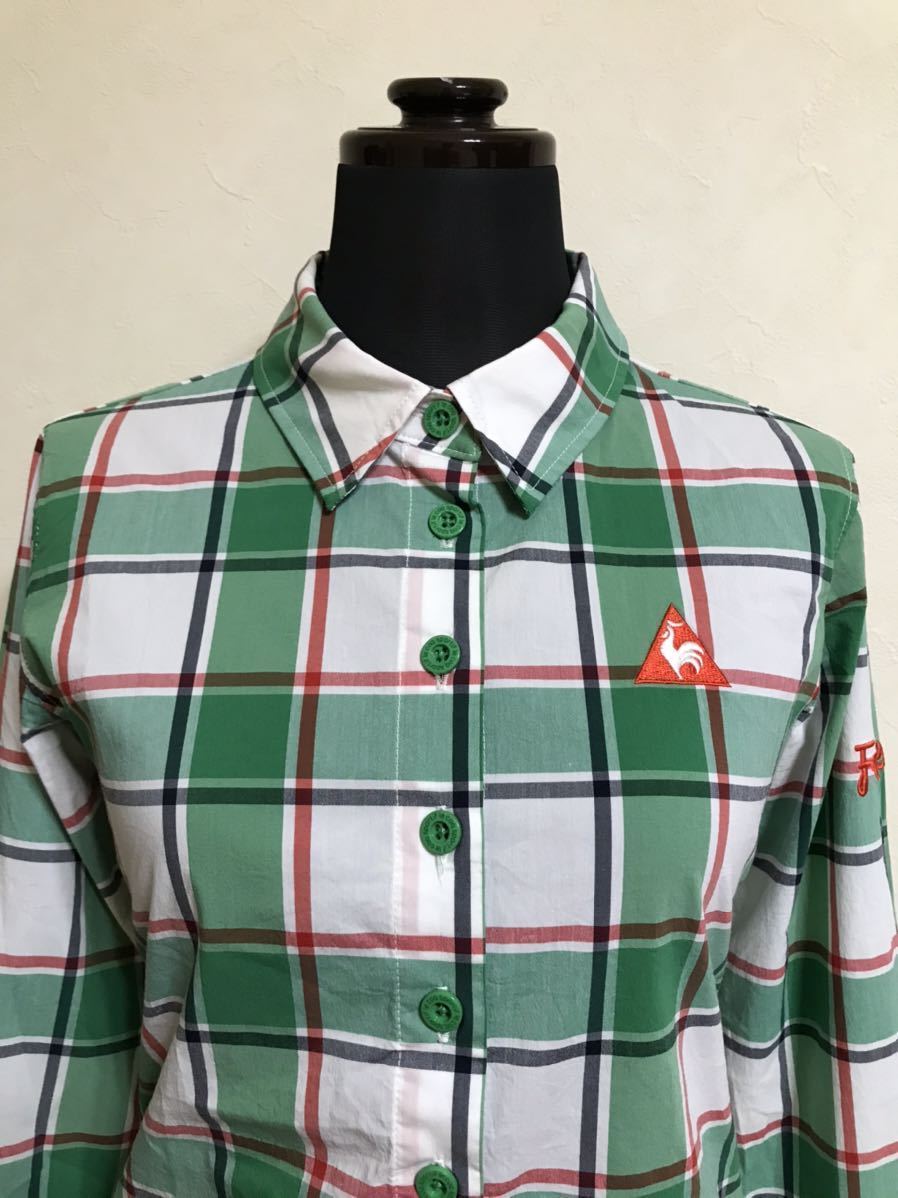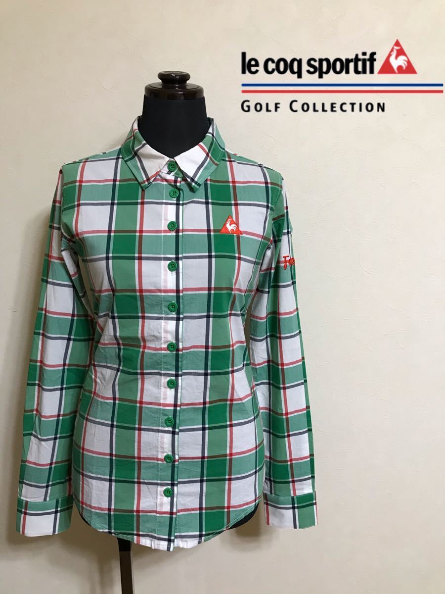 【美品】 le coq sportif golf ルコック ゴルフ レディース チェック柄 シャツ トップス グリーン サイズM 長袖 デサント QGL1006 緑白赤黒