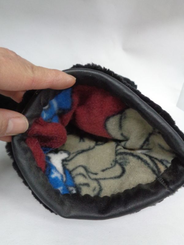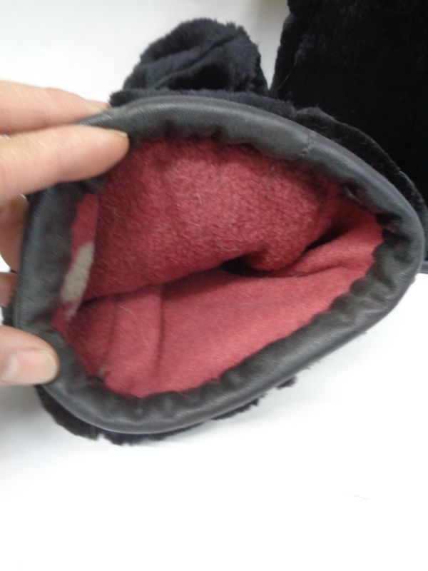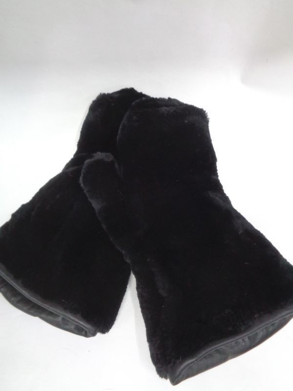 • メンズ・ブラック・シェアード・ビーバー毛皮ファー・ミトン。セクション毛皮仕立て。ブラックレザーの縁取り。裏地はフリース地。