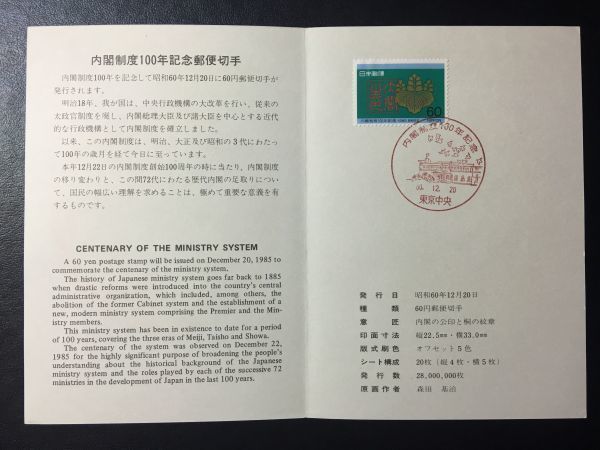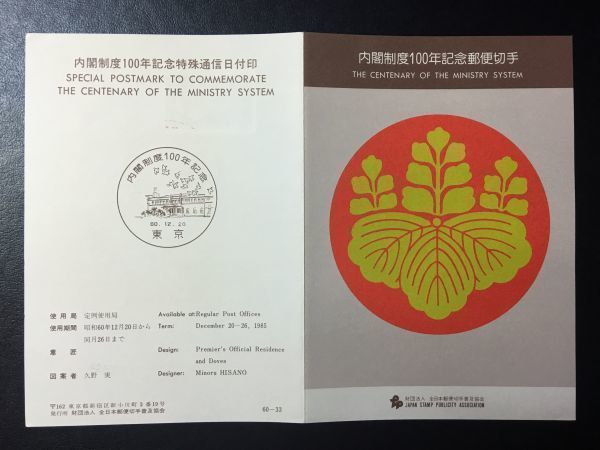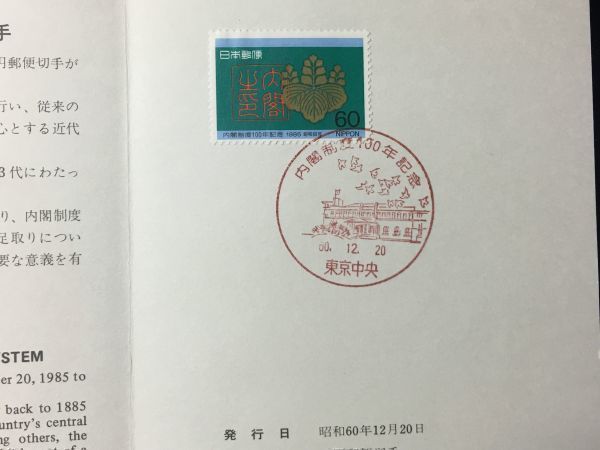 1953希少1985年全日本郵便切手普及協会 記念切手解説書 内閣制度100年東京中央60.12.20FDC初日記念カバー使用済消印初日印記念印特印風景印