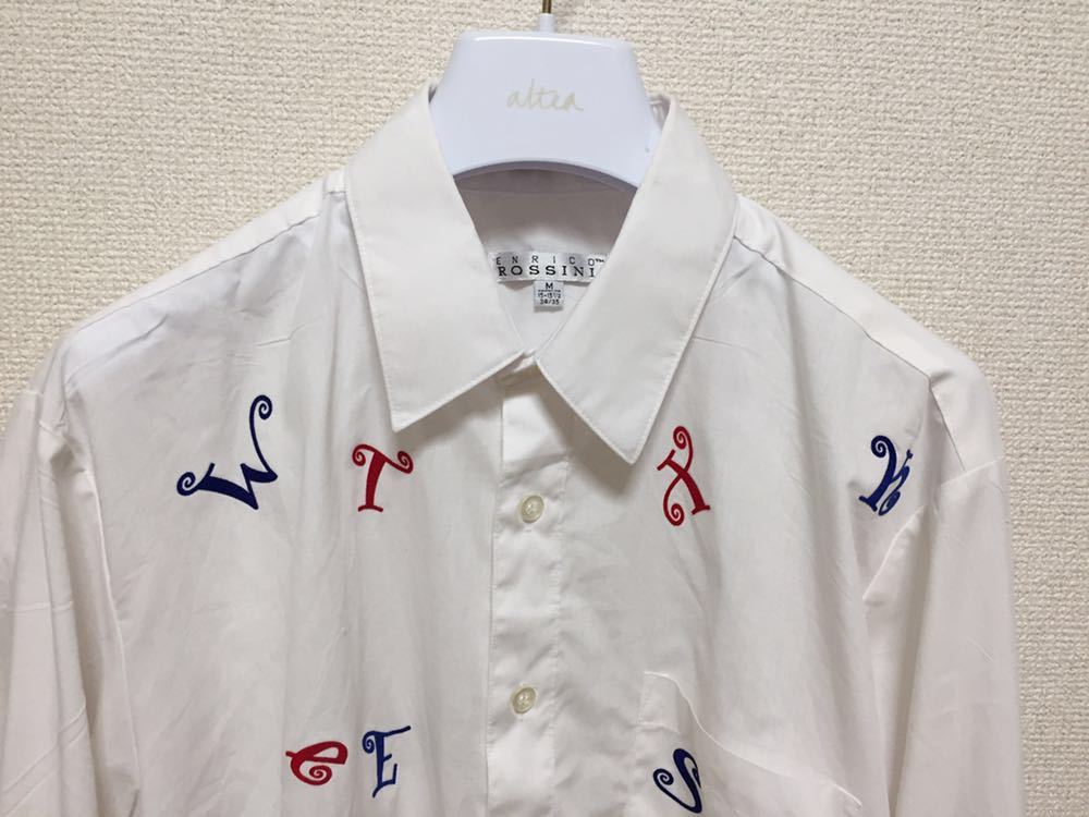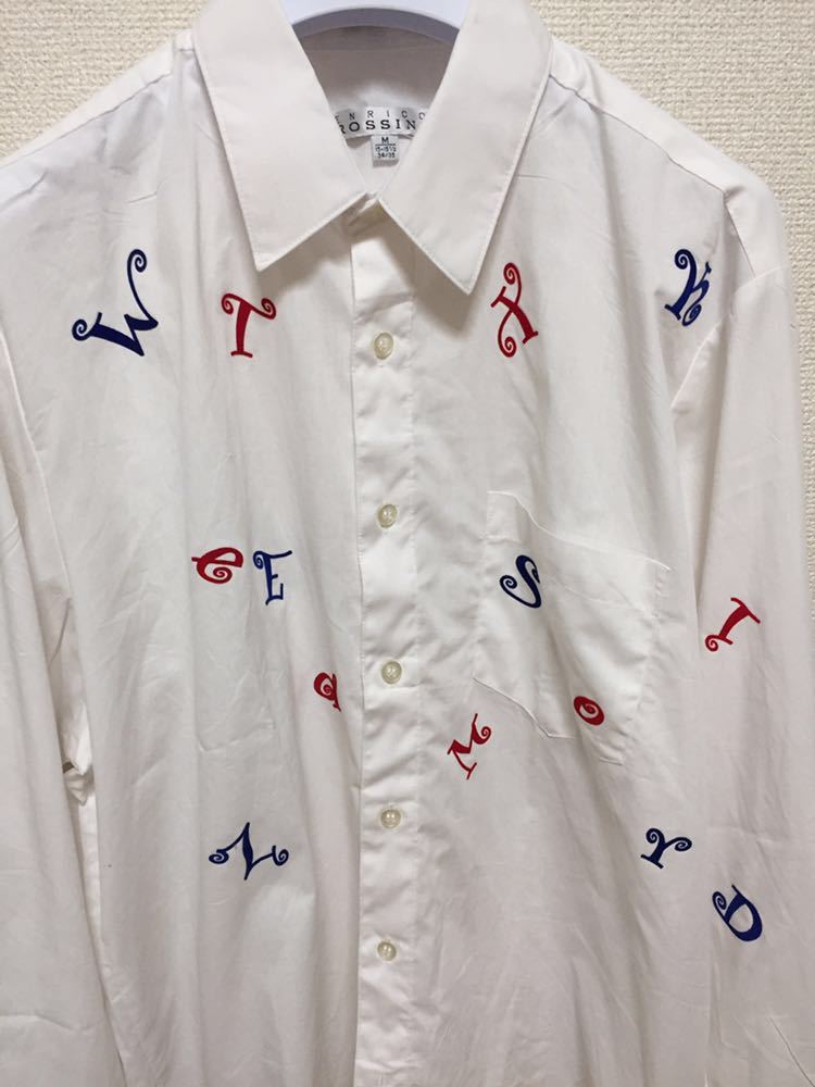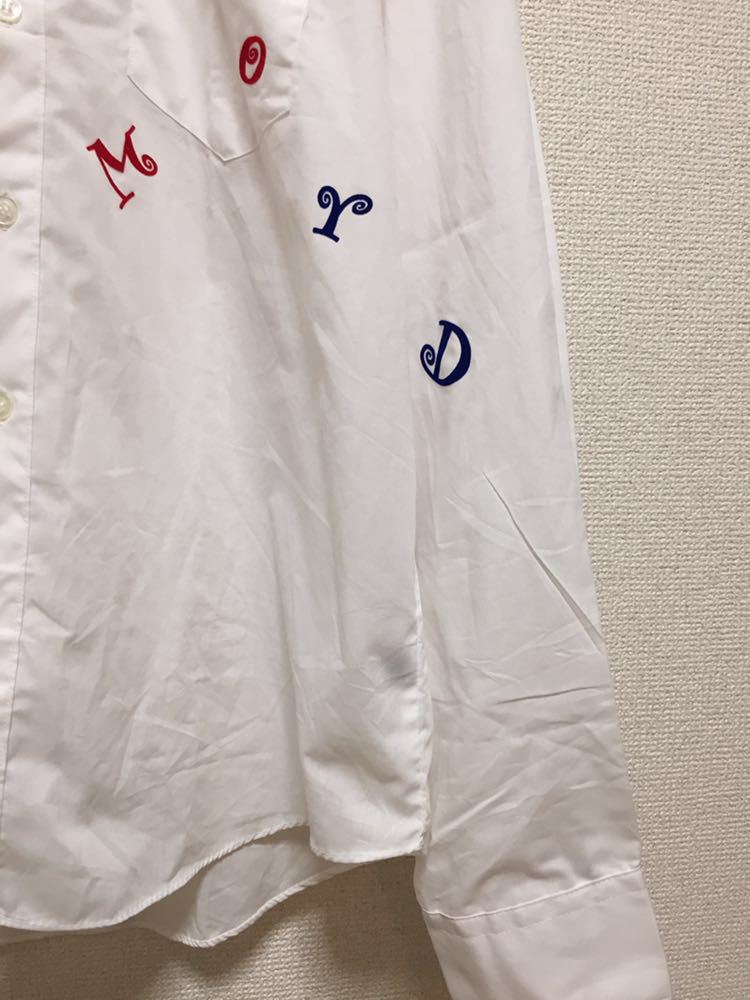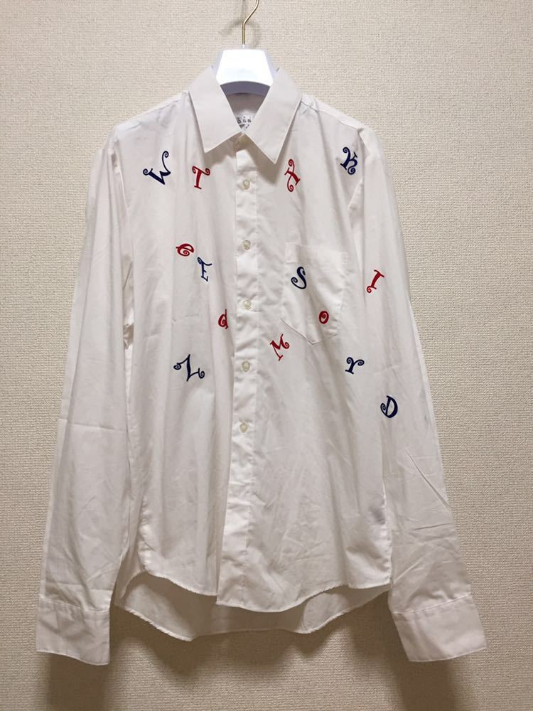 前面と左袖にアルファベットのワッペンがついているリメイクシャツになります。