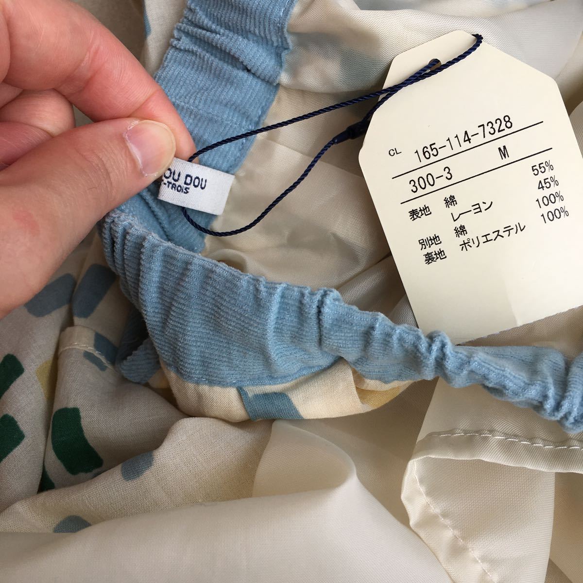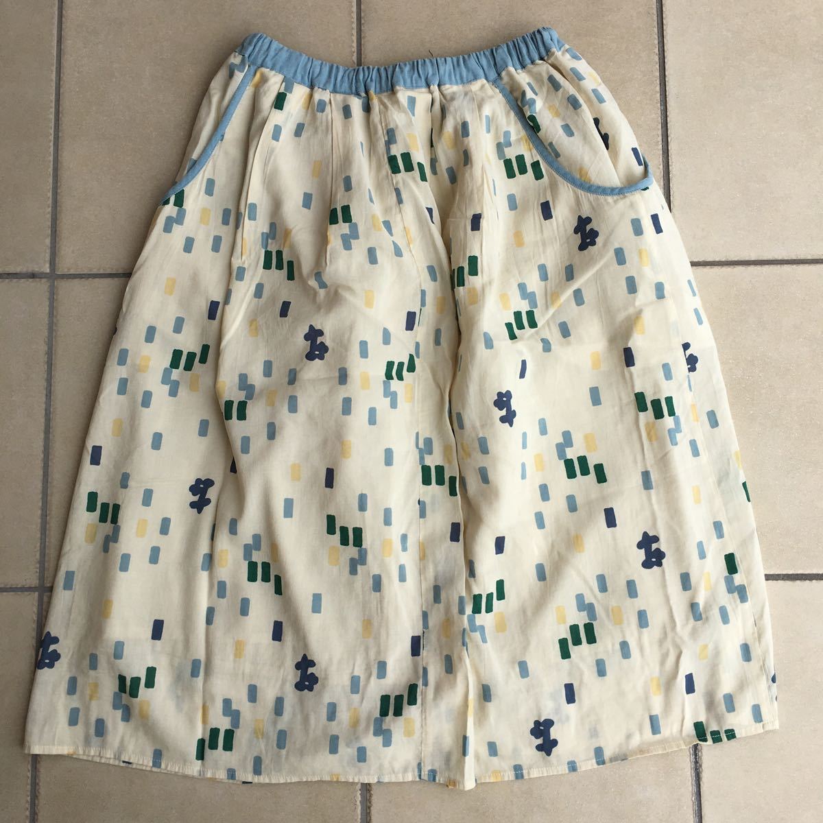 オリジナルのしずくパズルプリントのギャザー入りスカートです。ギャザーをたっぷり入れ、ボリューミーなシルエットに仕上げました。ウエスト部分はほっこりコーデュロイです。両サイドについた、おっきなポケットがアクセントポイントです。