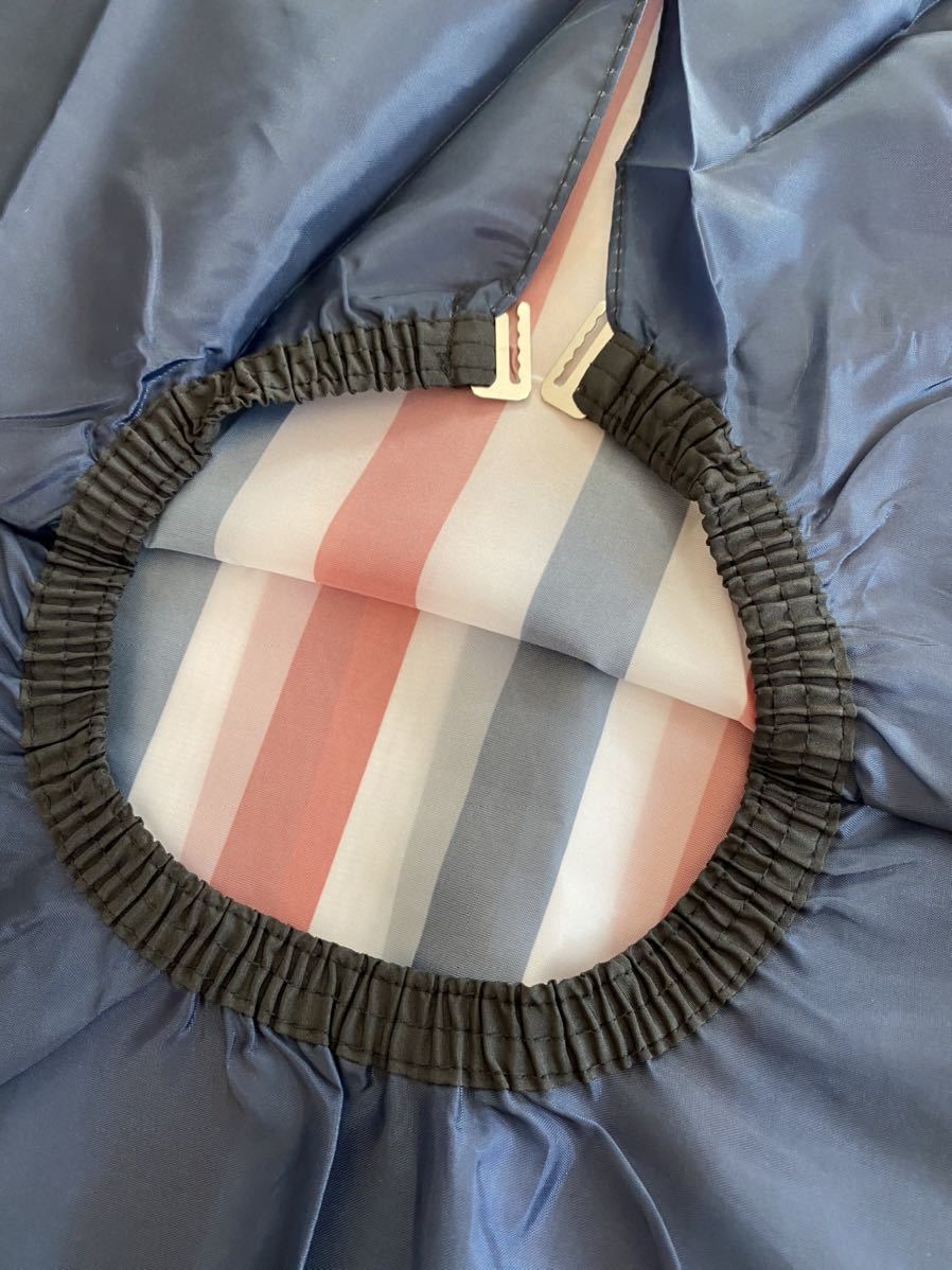 首元はゴム入り。サイズの調整は、マジックテープではなく両側の金具をゴム部に引っかけるタイプの為、おしゃれで衛生的、そして簡単に着用出来ます。(画像5)