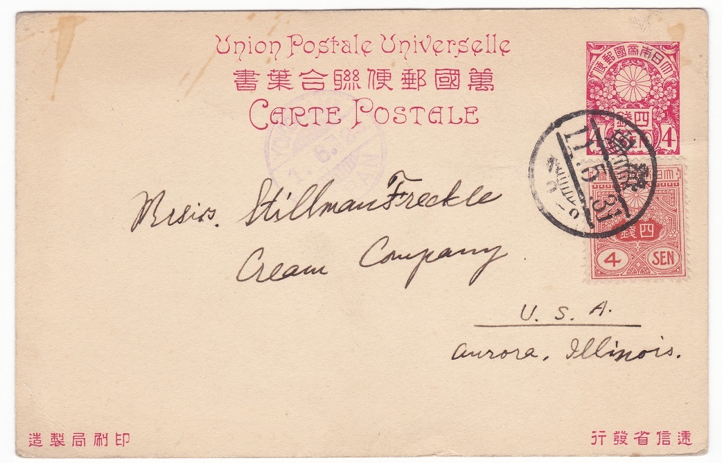 外信用桜連合4銭はがきに田沢旧大正毛紙4銭加貼 アメリカ宛