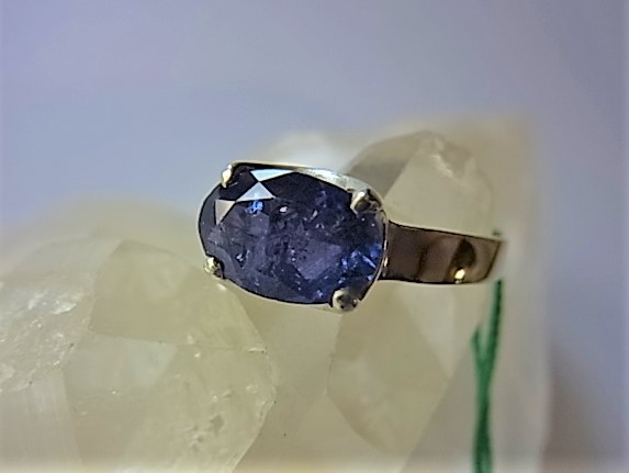 鮮やか味のある濃いブルーのタンザナイトです。インクルージョンが全体にあり、表面に原石時からある小傷があります。透明感とテリがあります。