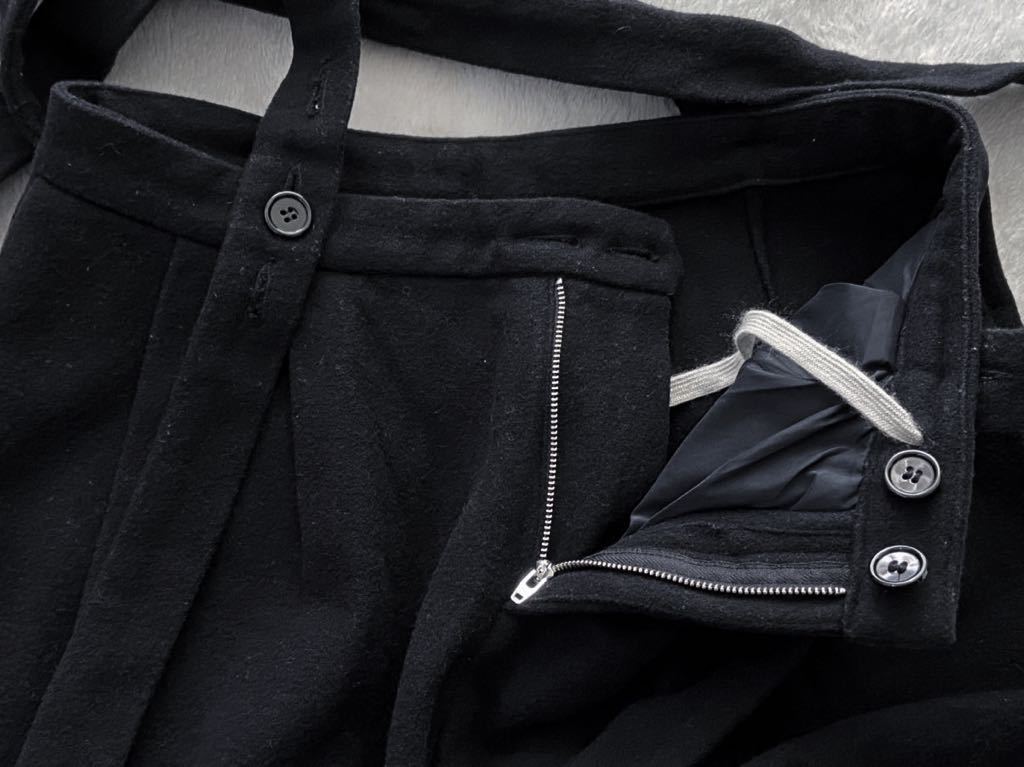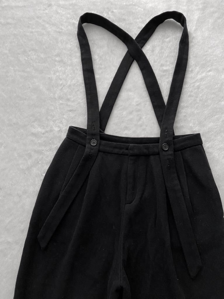・少し起毛感のある風合いの良い上質な生地を使いツータックで股上深いボリュームあるヒップ、わたりから裾に向かって緩くテーパードした計算されたモダンなシルエットに肩紐デザイン(*取り外し可能)が雰囲気抜群でとてもお洒落なパンツになります♪♪