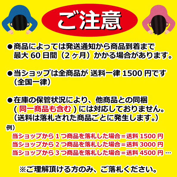 | また、こちらの商品は在庫の保管状況により同梱(同一商品も含む)での対応はできません。 そのため、 複数個ご落札いただいた場合、送料も個数分発生いたしますのでご注意ください。 | ||