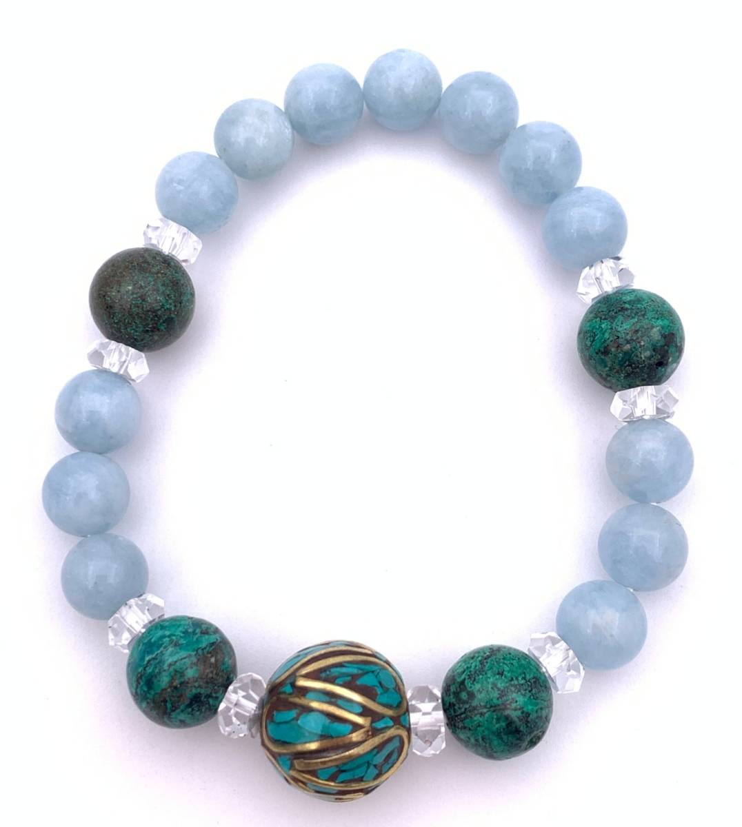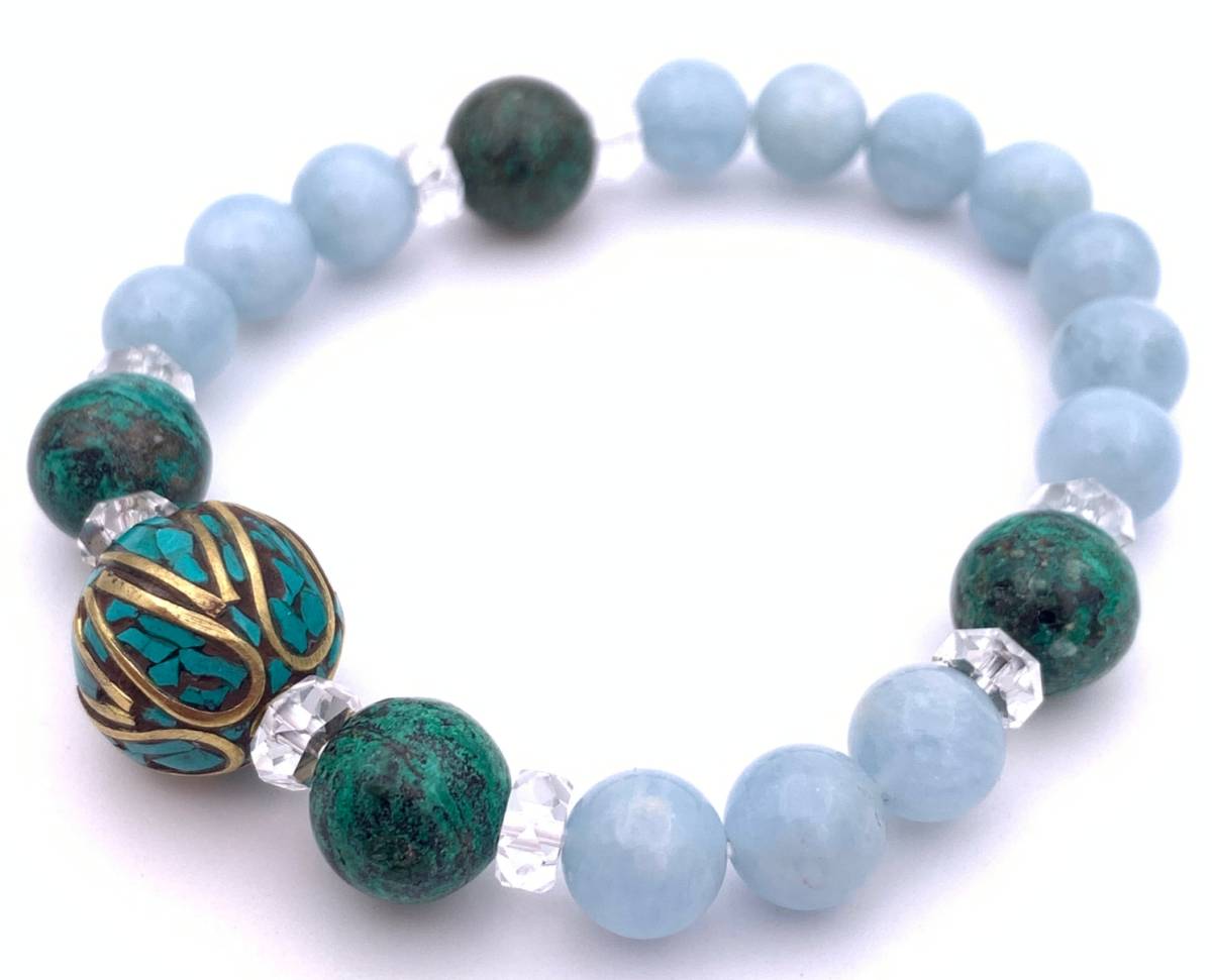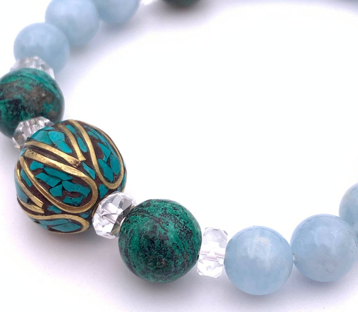 天然石アクアマリン&クリソコラ&アンティーク風ビーズのブレスレット