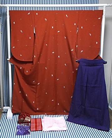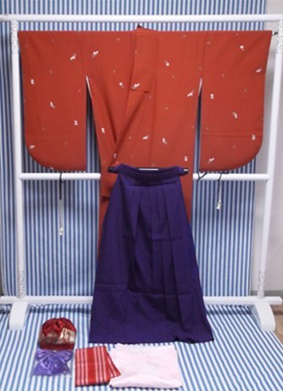 商品説明      二尺袖 袴 袴下帯 襦袢 巾着 髪飾りの6点セット 中古 お安くどうぞ