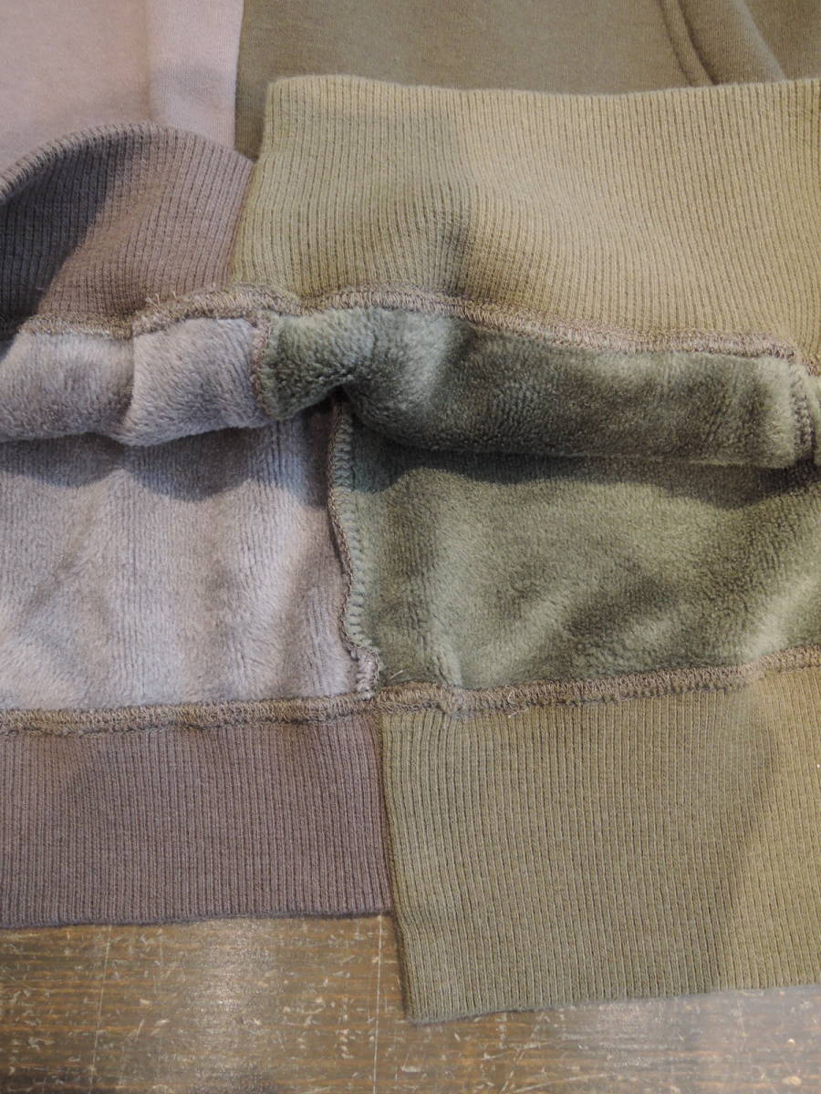 左右のシルエットと色が違うパーカをまん中で切り替えしています。