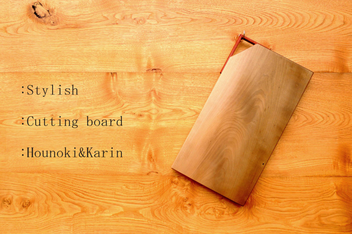 こちらは花梨(カリン)の取手がお洒落でカッコイイ、朴木(ホウノキ)のカッティングボードです。