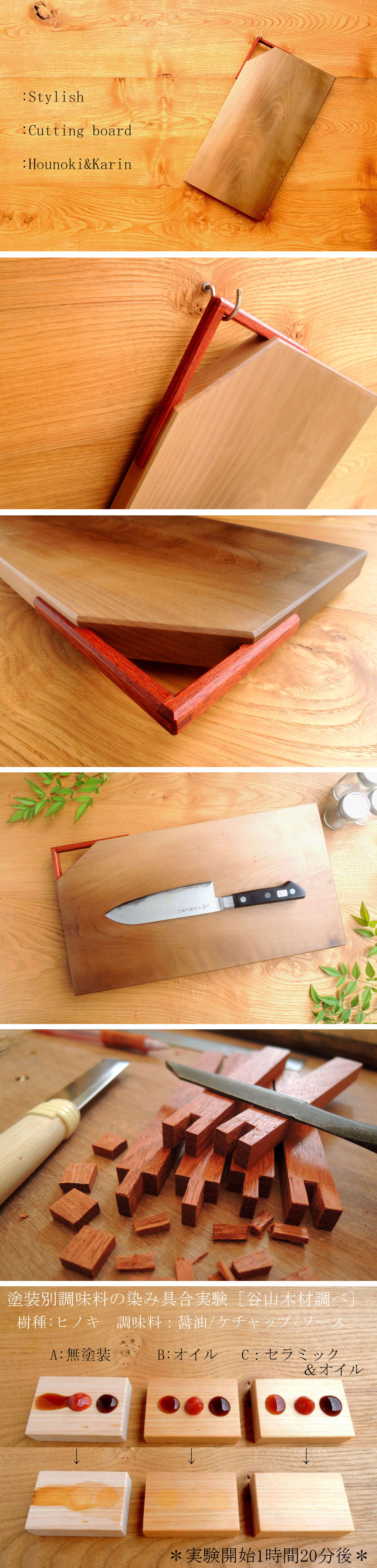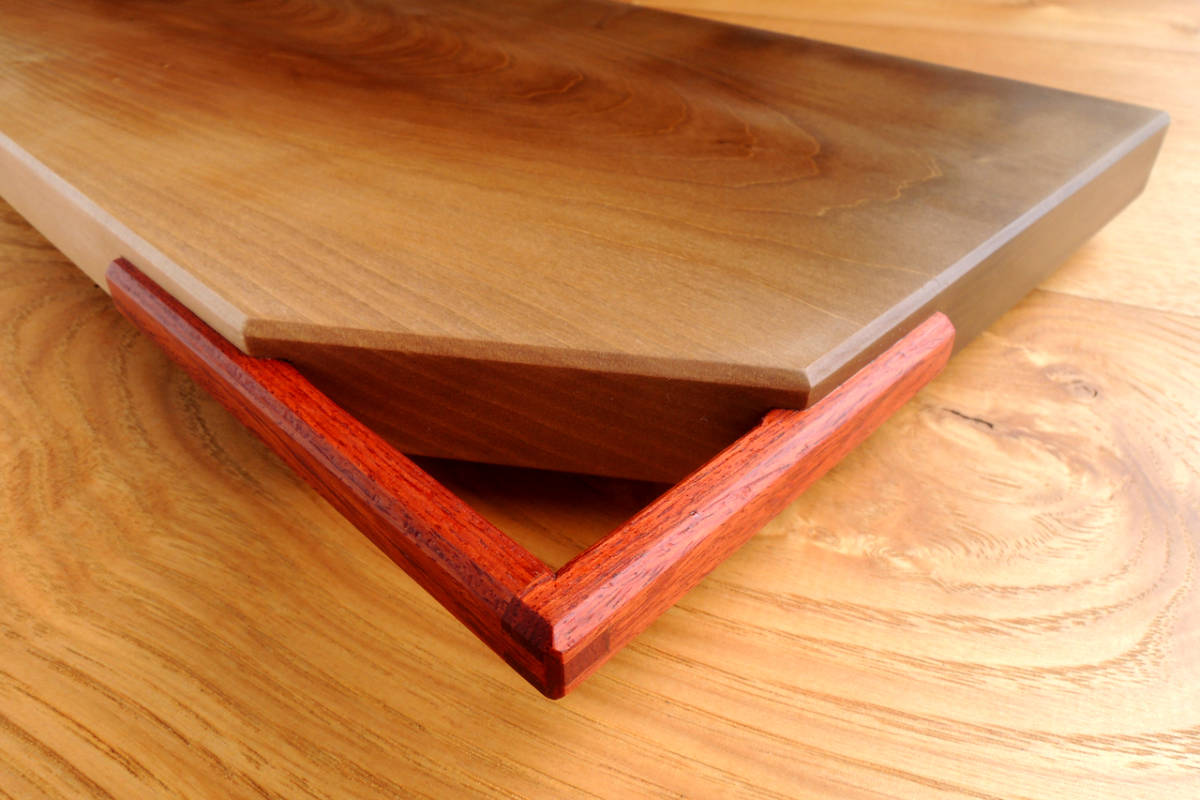 本体に使用しました朴木は宮崎産で、シックな緑色と、カリンの深い赤色が見事に溶け合って、スタイリッシュで都会的なカッティングボードになりました。