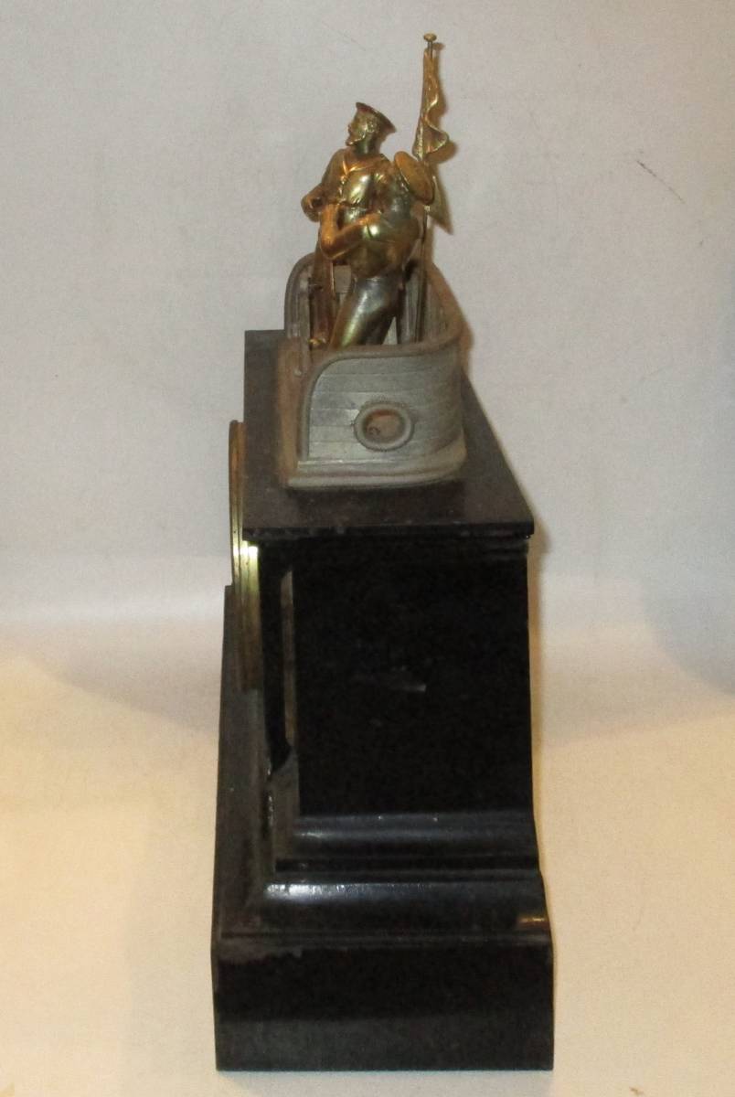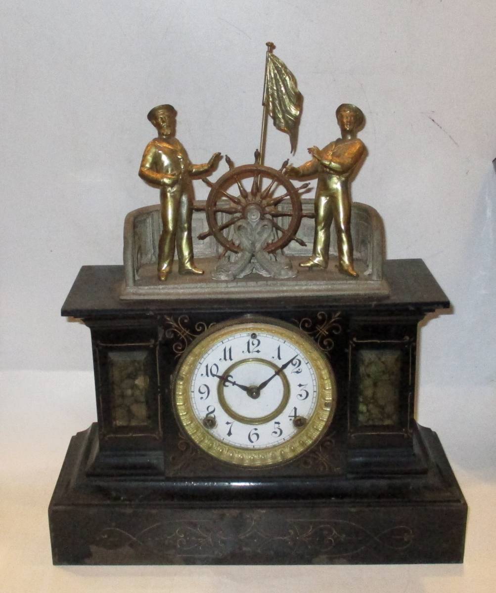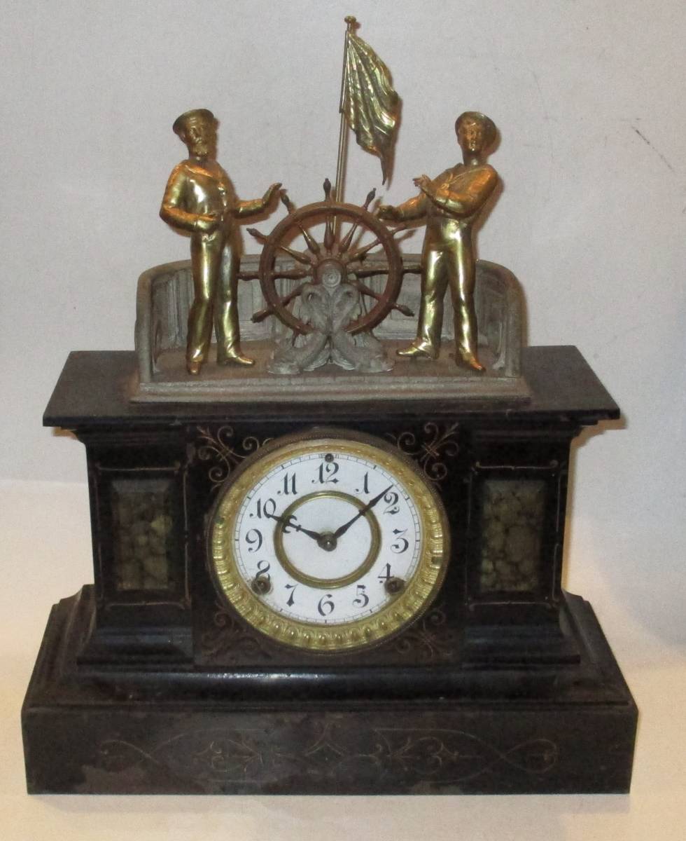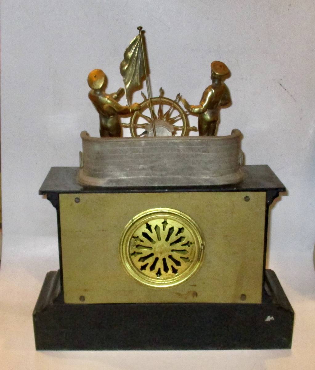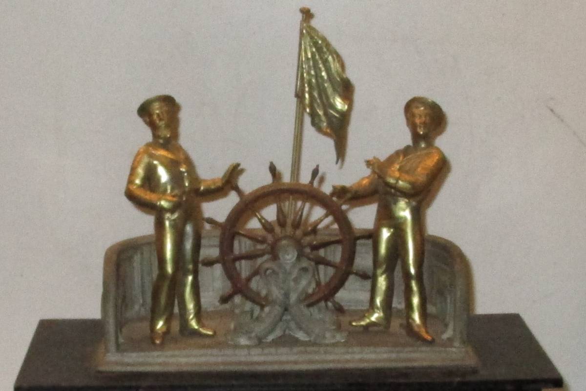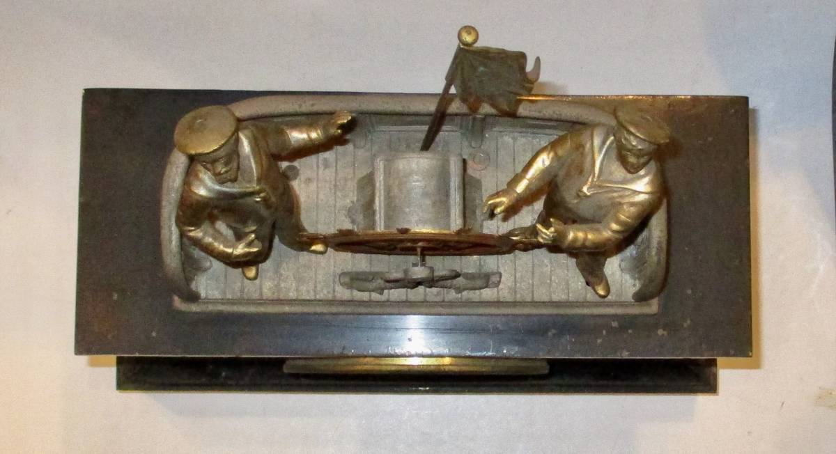 ☆鉄ケースです、状態は少し経年有りますが綺麗です。ブロンズ像はフラッシュの影響で赤く写っています。船員は何れも外すことが出来ます。鍍金は綺麗です。旗は星条旗です。捲き鍵付いています。