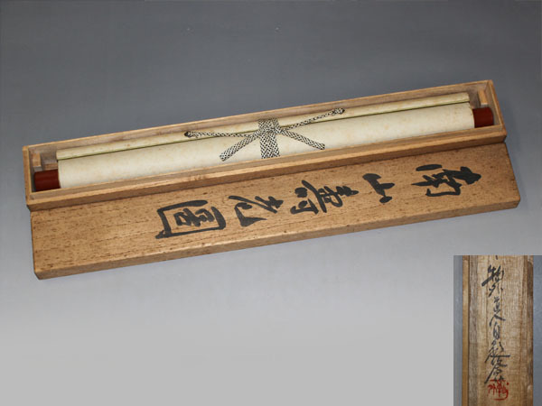 若狭物外 南画家・若狭成業(わかさ せいぎょう)の別号。秋田県生まれ。初め小野崎如水・高橋晁山に入門し、上京後寺崎広業に、のち京都で山田介堂に学ぶ。中国へ歴遊し、王一亭・呉昌碩と親交し、その影響を受けた。巽画会会員。昭和32年(1957)歿、71才。 本紙は、染み、ヤケがあります。 表装は、軽い染み、皺、軽い折れがあります。 【サイズ】 作品 横約36.5cm×縦約123.5cm 表装 横約48.5cm×縦約196cm |