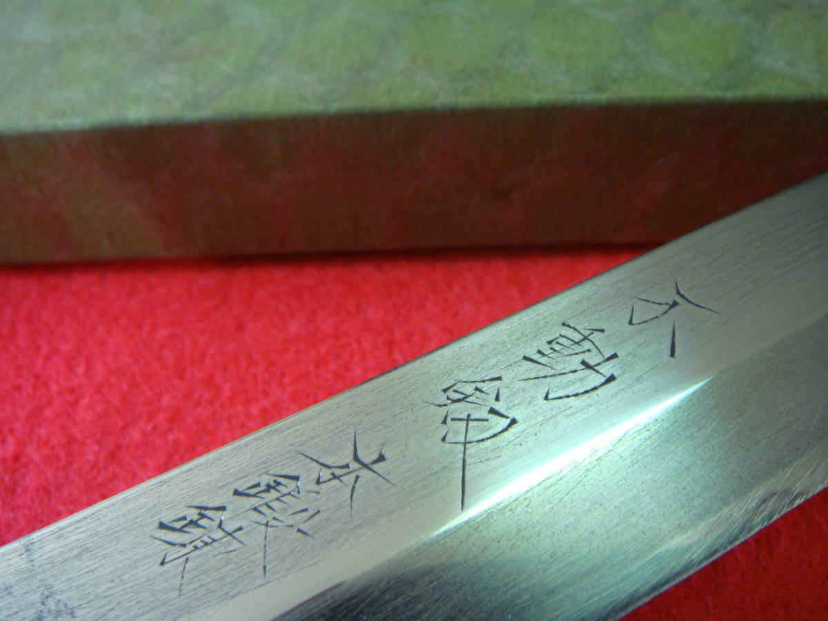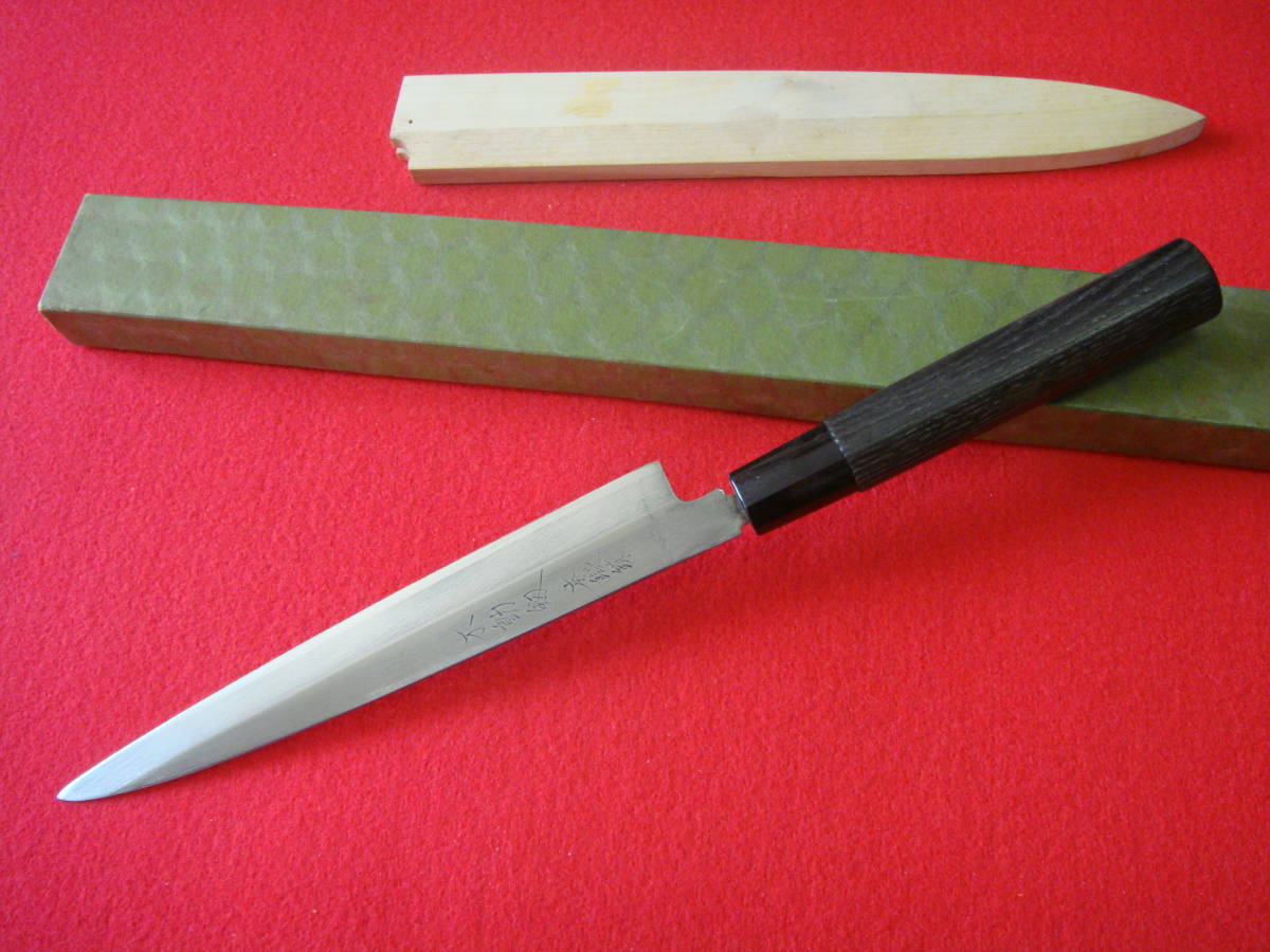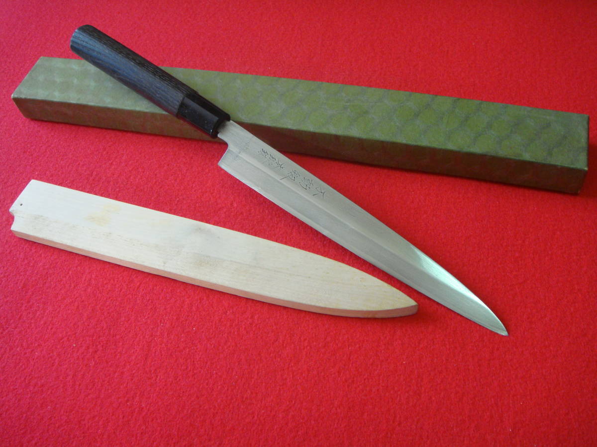 【不動釼】本鍛錬 刺身包丁 刃渡19.8㎝ 全長35.1㎝ 峰厚3.4㎜ 鞘付 箱付 ※中古品 全国一律送料870円
