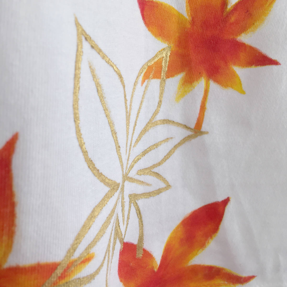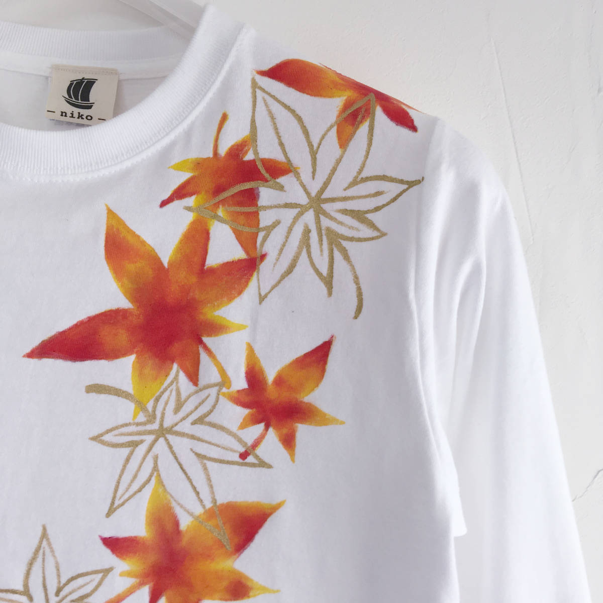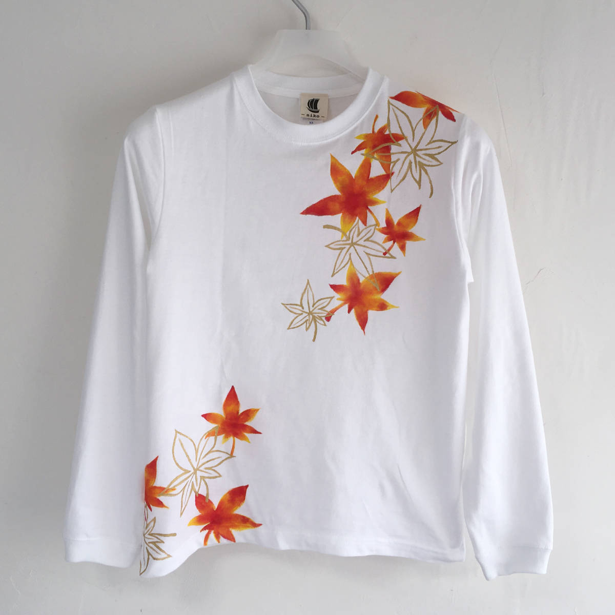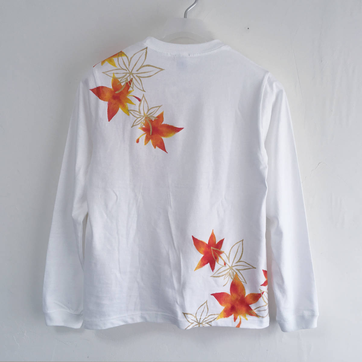 ハンドメイド 手描き袖リブ長袖Tシャツ 手書き舞紅葉柄袖リブロングTシャツ | |||
